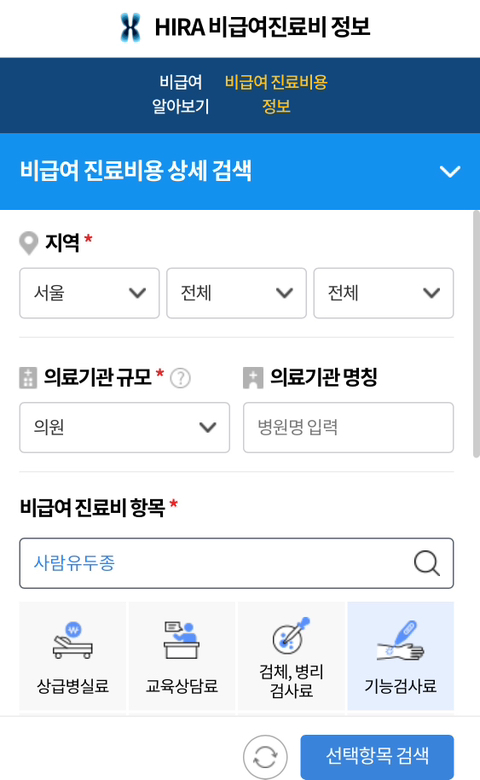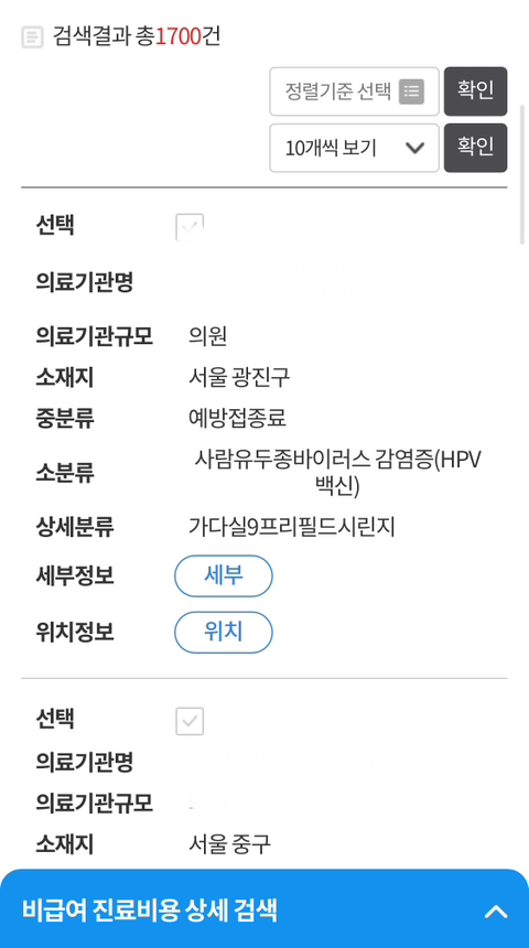 지역, 의료기관 규모 설정 후 비급여 진료비 항목엔 ‘사람유두종’쓰고 검색