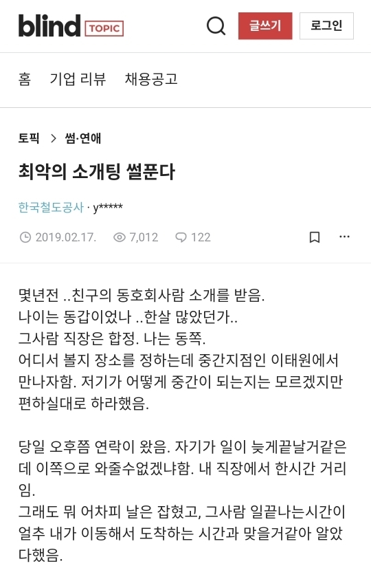 [기타]최악의 소개팅 썰 푼다.blind 작성자폴라리스|작성시간22.09.01|조회수3,149 목록 댓글 14 글자크기 작게가 글자크기 크게가 출처 https://www.teamblind.com/kr/post/최악의-소개팅-썰푼다-1xQ5Vsu6썸·연애: 최악의 소개팅 썰푼다몇년전 ..친구의 동호회사람 소개를 받음.나이는 동갑이었나 ..한살 많았던가..그사람 직장은 합정. 나는 동쪽.어디서 볼지 장소를 정하는데 중간지점인 이태원에서 만나자함. 저기가 어떻게 중www.teamblind.com 다음검색 현재 게시글 추가 기능 열기 북마크 공유하기 신고 센터로 신고 댓글 댓글 14 댓글쓰기 답글쓰기 댓글 리스트 작성자찰떡버터눈 | 작성시간 22.09.01 여자분 보살이다 다음생에 금수저로 태어날듯 작성자너 혹시.. 이름 도롱뇽이야? | 작성시간 22.09.01 진짜 죽여도 되나? 작성자우동탕 귀요미 | 작성시간 22.09.01 와 시발 개도랐네 작성자메리다 | 작성시간 22.09.01 crαzч 도랐나 작성자에프곰 | 작성시간 22.09.01 와...예의범절 뭐냐... 마트에서 세제 안 던진거 진짜 대단하다 댓글 전체보기