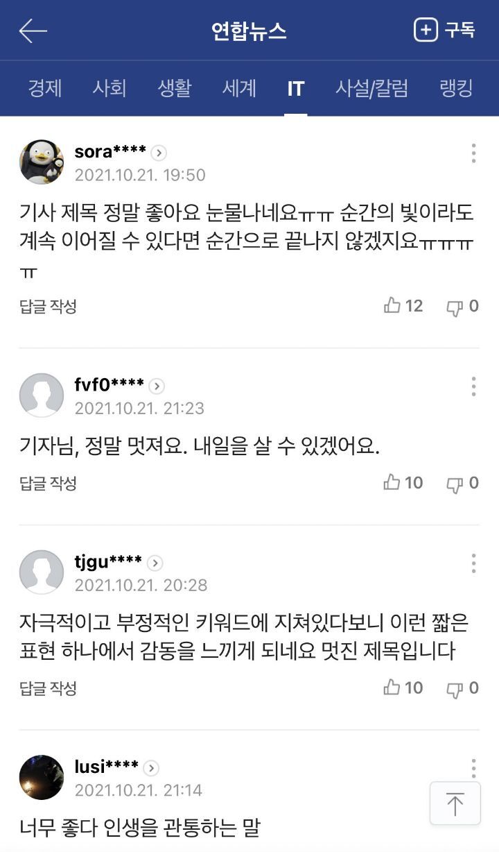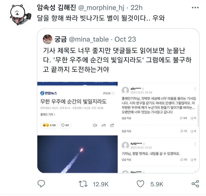 [스크랩] [감동/눈물]달을 향해 쏴라 빗나가도 별이 될것이다 작성자안개|작성시간22.11.02|조회수666 목록 댓글 1 글자크기 작게가 글자크기 크게가 출처 : https://twitter.com/_morphine_hj/status/1451733128385495051?s=20null댓글도 너무 감동적... 다음검색 스크랩 원문 : *여성시대* 차분한 20대들의 알흠다운 공간 현재 게시글 추가 기능 열기 북마크 공유하기 신고 센터로 신고 댓글 댓글 1 댓글쓰기 답글쓰기 댓글 리스트 작성자펭귄뛰뚱 | 작성시간 22.11.02 크 좋다 내용도 글도 다 좋네 댓글 전체보기