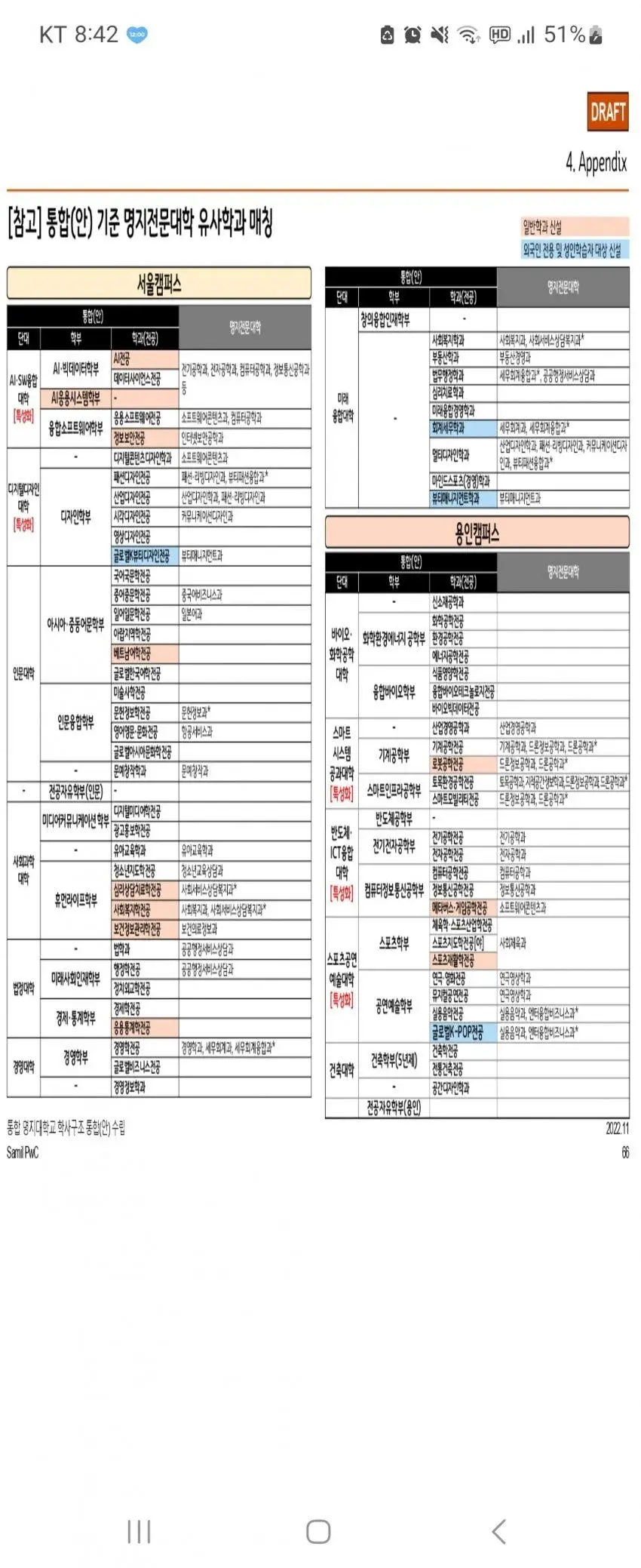 우리 동네 목욕탕 [기타]명지대-명지전문대 통합 초안 작성시간22.12.05|조회수13,187 목록 댓글 2 글자크기 작게가 글자크기 크게가 서울캠퍼스 AI소프트웨어융합대학디지털디자인대학인문대학사회과학대학법정대학경영대학미래융합대학(사회복지·부동산·법무행정·심리치료 등) 용인캠퍼스 바이오화학공학대학스마트시스템공학대학(기계·토목)반도체ICT융합대학스포츠공연예술대학건축대학 4년제+전문대 통합사례 자체가 많지가 않은데다 수도권에선 2006년 고려대+고려보건대, 2007년 경원대+경원전문대(이후 가천의대 통합후 가천대) 이후 사실상 처음이라 관심이 큼 인 서울 전문대 자체가 9개밖에 없기도 하고.. 다음검색 현재 게시글 추가 기능 열기 북마크 공유하기 신고 센터로 신고 댓글 2 댓글 리스트 작성시간 22.12.05 명지전문대 다니던 사람들은 명지대로 편입되는건가? 아니면 지금 재학생까지만 학생 받고 그 이후로는 명지대 학생으로만 받는거? 고려대 통합되었다는건 처음 알았네 작성시간 22.12.05 헐 명지대 애들 안좋아하겠다 카페 방문해 더 많은 댓글 만나기!