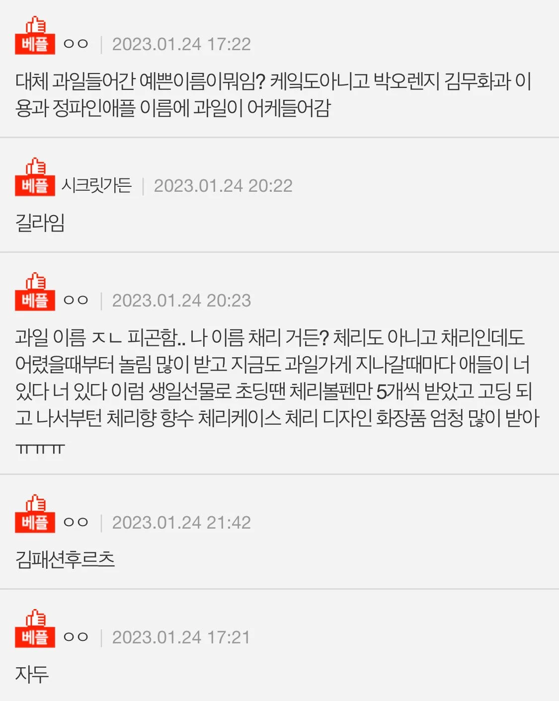 우리 동네 목욕탕 [판&톡]과일 들어간 예쁜 이름 뭐있음 작성시간23.01.25|조회수16,396 목록 댓글 81 글자크기 작게가 글자크기 크게가 다음검색 현재 게시글 추가 기능 열기 북마크 공유하기 신고 센터로 신고 댓글 81 댓글 리스트 작성시간 23.01.25 고망고 작성시간 23.01.25 ㅋㅋㅋㅋㅋㅋㅋㅋㅋㅋㅋㅋㅋㅋㅋㅋㅋ 작성시간 23.01.25 양람부탄 작성시간 23.01.26 자몽근기 작성시간 23.02.15 홍시호채리나감우성반하나배수지 최열매 카페 방문해 더 많은 댓글 만나기!
