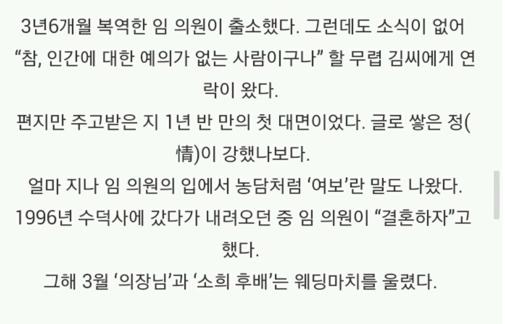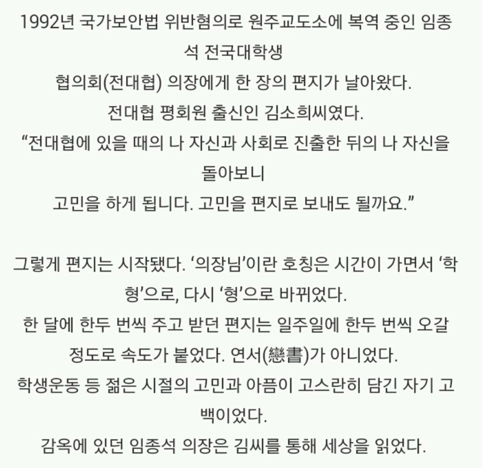 임종석은 드라마같은 러브스토리도 가지고 있는데 복역 중인 임종석에게 현재 아내인 김소희 후배의 편지가 오게 되며 인연이 시작됨