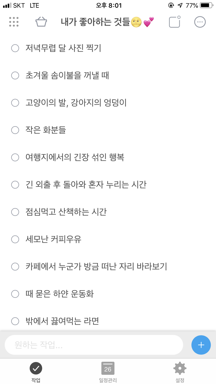그래서 삶이 건조한 무채색처럼 느껴질 때가 많았는데 신기하게도 내가 좋아하는 것들을 적는 시간 만큼은 내 일상이 오색찬란하게 느껴지더라고.
