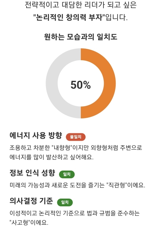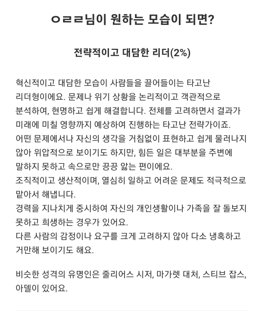 MBTI의 고급버전이라고 보면 되고 원래는 유료 테스트인데 이건 무료 버전이라 테스트도 결과도 간단하게 나온 것 같아
