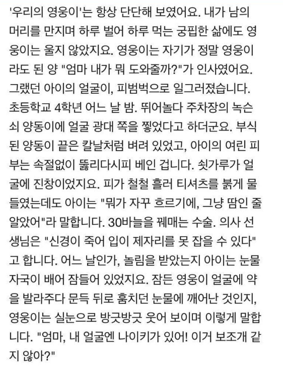[스크랩] [기타]임영웅 얼굴 흉터 알고 있었다vs몰랐다 작성자구르미 그린 달빛|작성시간23.06.06|조회수28,073 목록 댓글 47 글자크기 작게가 글자크기 크게가 출처 : 여성시대 내가그렇게렇게만만하니 엄마가 귀에 딱지가 앉게 말해줘서 알았다vs 관심없어서 몰랐다 화장기 없으면 생각보다 엄청 도드라짐 움푹패임연예인이 얼굴에 저렇게 큰 흉터 가진거 첨본듯...어릴때 다친거라고 함웃을때 한쪽 입만 올라가서 표정연습 많이했다고 함 이게 비교적 최근 기사 사진인데메이크업으로 가려서 보조개처럼 보이는 듯 욕망돋으면 안됨 욕망아님문제시 임영웅말고 황영웅 하차하셈문제 안되도 하차해라 다음검색 스크랩 원문 : *여성시대* 차분한 20대들의 알흠다운 공간 현재 게시글 추가 기능 열기 북마크 공유하기 신고 센터로 신고 댓글 댓글 47 댓글쓰기 답글쓰기 댓글 리스트 작성자최빛 | 작성시간 23.06.06 헐 커버 기술 무슨 일이야 대박 작성자여름싫어욧 | 작성시간 23.06.14 헐 모름 작성자seojisu | 작성시간 23.06.14 나도엄마가 ㅈㄴ 말해서 앎ㅋㅋㅋㅋ 작성자apc처돌이 | 작성시간 23.06.16 헐 몰랐어 작성자해봄 | 작성시간 24.02.25 헐 그냥 광대+보조갠줄알았는데 첨알앗다 댓글 전체보기