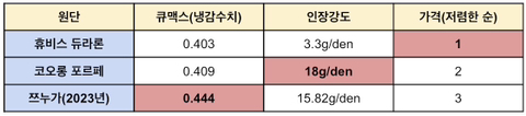 이게 단순히 섬유가 강하다는 게 아니라 보풀이 잘 안 일고 그런것 같기도 하고.. 섬유 잘알들아 누가 설명 좀 부탁해..ㅠㅠ 아무튼 제일 시원한건 쯔누가 제일 강한건 포르페. 근데!!!!! 쯔누가는 2023년 리뉴얼된 원단의 큐맥스가 0.444이고 작년 원단은 0.389래. 리뉴얼된 원단을 사용하는 업체는 단 한 곳이었음.