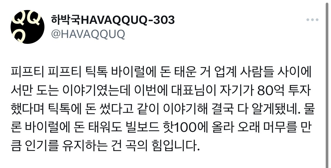 우리 동네 목욕탕 [기타]업계 사람들만 안다는 피프티피프티 80억대 바이럴썰.jpg 작성시간23.06.30|조회수6,840 목록 댓글 12 글자크기 작게가 글자크기 크게가 80억 투자해서 숏폼 바이럴 돌려서 빌보드 차트 올려줬는데돌아오는 건 전속 계약 해지... 글쓴이 하박국님은 영기획(young gifted & wack) 소속음악 기획자이며 현재 유튜버로 활동하고 있다고 함 다음검색 현재 게시글 추가 기능 열기 북마크 공유하기 신고 센터로 신고 댓글 12 댓글 리스트 작성시간 23.06.30 기업편 들게 하지말라고! 작성시간 23.06.30 헐 몰랐네....멤버들도 몰랐나??? 작성시간 23.06.30 아니 진짜........ 나 소속사 편들어보긴 또 처음이다 작성시간 23.07.01 와...ㅋㅋㅋㅋㅋㅋㅋㅋㅋㅋ 작성시간 23.07.01 진심 개너무함 카페 방문해 더 많은 댓글 만나기!