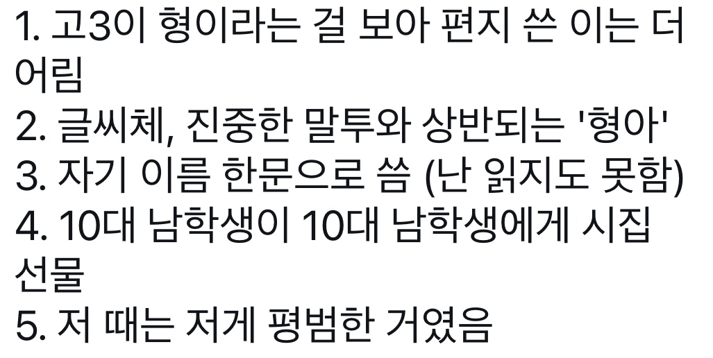 [기타]1991년도에 남자끼리 주고받던 선물 작성자아방방|작성시간23.07.25|조회수2,377 목록 댓글 22 글자크기 작게가 글자크기 크게가 다음검색 현재 게시글 추가 기능 열기 북마크 공유하기 신고 센터로 신고 댓글 댓글 22 댓글쓰기 답글쓰기 댓글 리스트 작성자으아아아아엥 | 작성시간 23.07.25 지금 새끼들은 어휴.. 글씨부터 다름 작성자다현애인 | 작성시간 23.07.25 기강잡자 작성자초현실주의 | 작성시간 23.07.25 에효 지금은... 진짜 말세다 작성자토끼털실내화 | 작성시간 23.07.25 𝙎𝙄𝘽𝘼𝙇 쭉정이 이론 작성자뿌앙이 | 작성시간 23.07.25 짧은데 무게가 있다 너무 좋다.. 댓글 전체보기