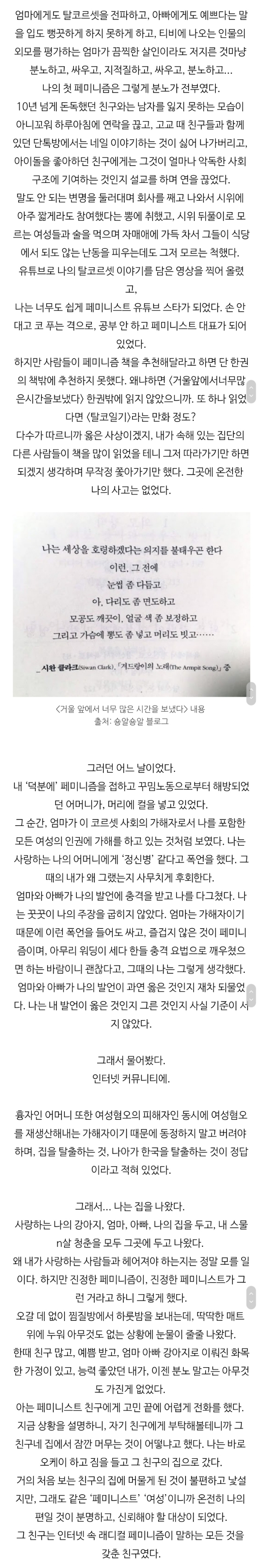 작성자엄마 제발 나 좀 냅둬주라 작성시간 23.08.27 이해가는 부분도 있긴해.. 분노를 원동력으로 삼는게 진짜 힘들거든.. 그리고 탈페미 선언했다고해서 지컨이 "여적여", "여자라면~남자라면~" 이런말은 안할거임. 래디컬까진 아닐뿐.. 가부장제엔 거부감 갖고있을건데 뭐..