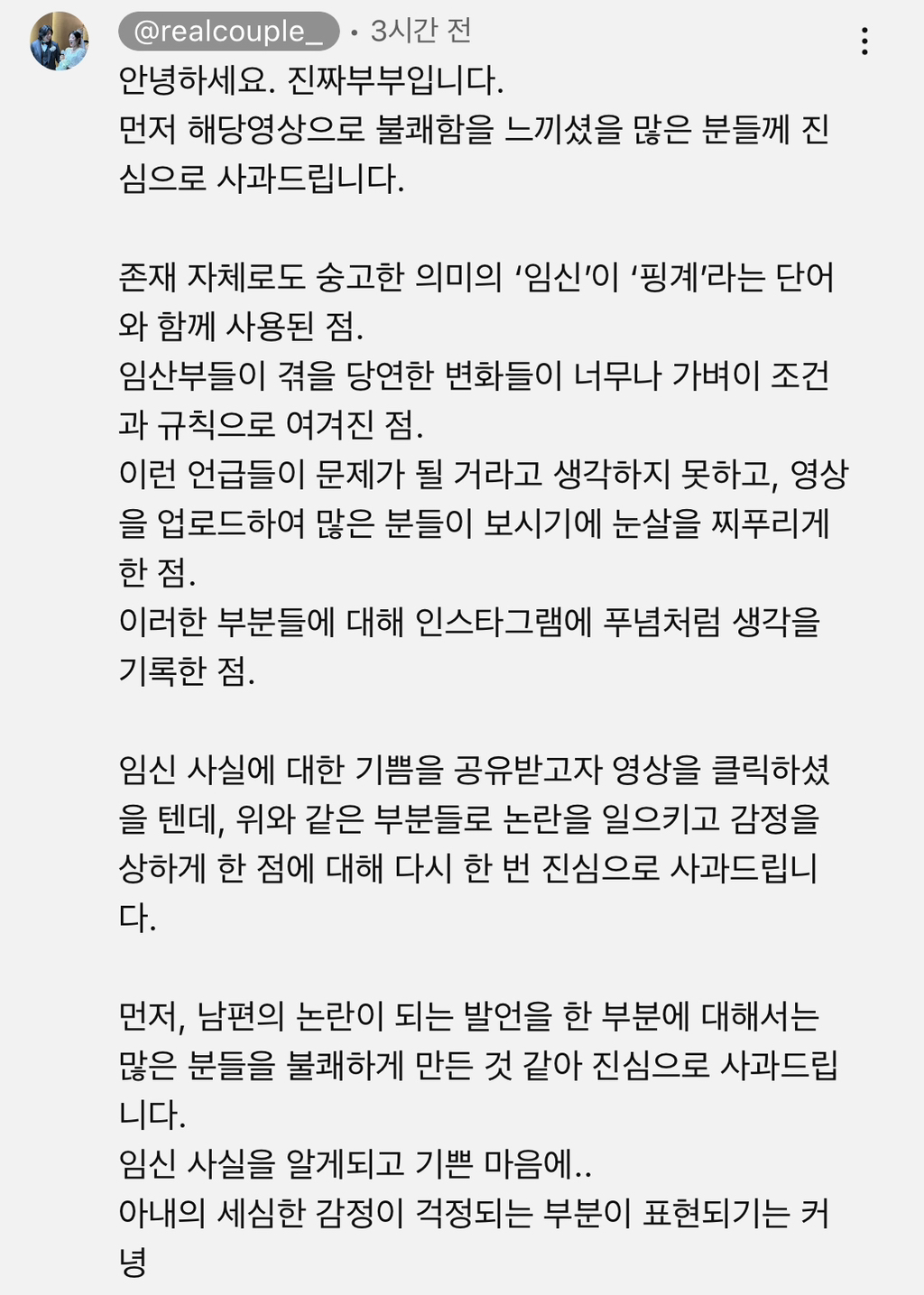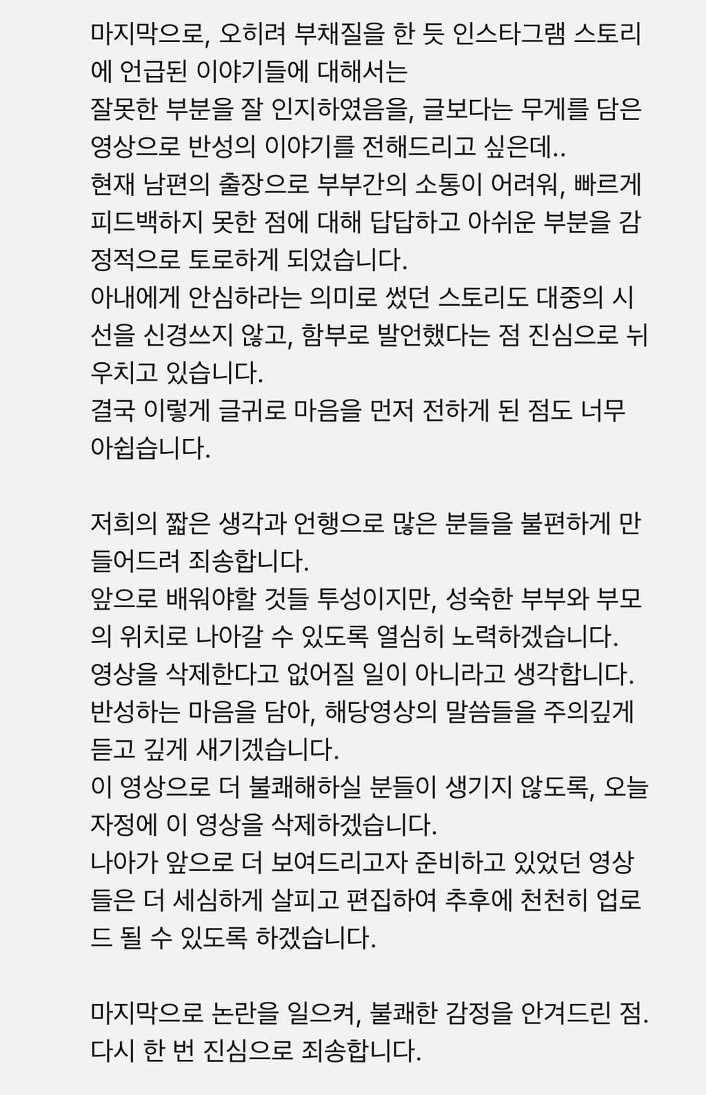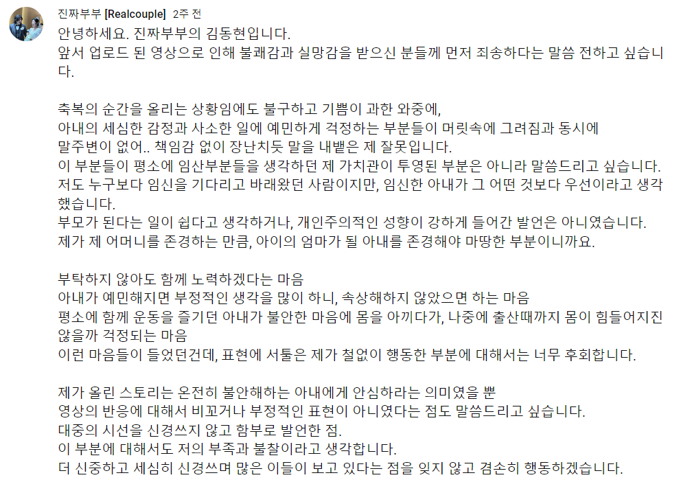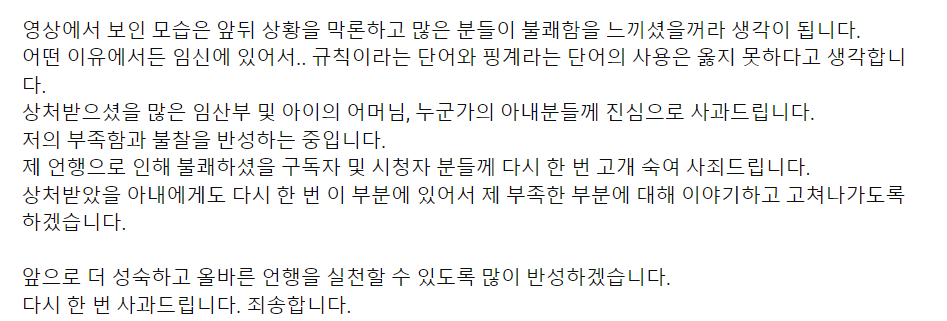 [기타]유튜버 진짜 부부 임신 영상 논란 이후 작성자데미안웨인|작성시간23.08.27|조회수93,369 목록 댓글 62 글자크기 작게가 글자크기 크게가 《 우리 동네 목욕탕 / 닉네임 》 참고로 아내인 여자는 예전에 웅엥웅 썼다가 ^패미^ 안한다고 인스타 스토리에 글 남김 여자가 남편 커버치고 남자는 이렇게 사과문을 올리고 반성을 한 줄 알았으나....^^반성은 개뿔 이런식으로 자기 옹호해주는 댓에만 좋아요 누르고 쓴소리 하는 댓에는 좋아요 안누르고 기싸움중이래서 기혼녀들은 편 들어주면 안됌 아직도 저 진짜 팥 부인분은 남편 편 들어주는 중~ 결론 : 흉자 기혼녀들은 걱정해 줄 필요 없다 다음검색 현재 게시글 추가 기능 열기 북마크 공유하기 신고 센터로 신고 댓글 댓글 62 댓글쓰기 답글쓰기 댓글 리스트 작성자산책 | 작성시간 23.08.28 그..죠? 작성자샤이니키 | 작성시간 23.09.03 지팔지꼰 ㅋㅋㅋㅋㅋ 작성자강하늘 | 작성시간 25.06.24 이혼 했던데 작성자홍매화 | 작성시간 25.06.25 이혼했음 인스타에 저 남편이 운영?다니는? 학원생 학부모랑 바람났다는 추정글 올라오고 저 아내는 애 혼자 키운지 꽤 됐다고 유튜브 올라옴 작성자멜론빙수 | 작성시간 25.06.26 근데 이혼했잖아 ㅋ 댓글 전체보기