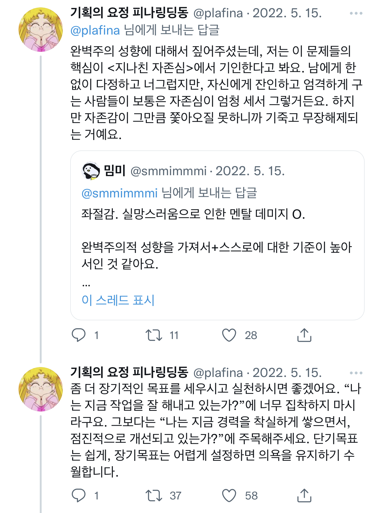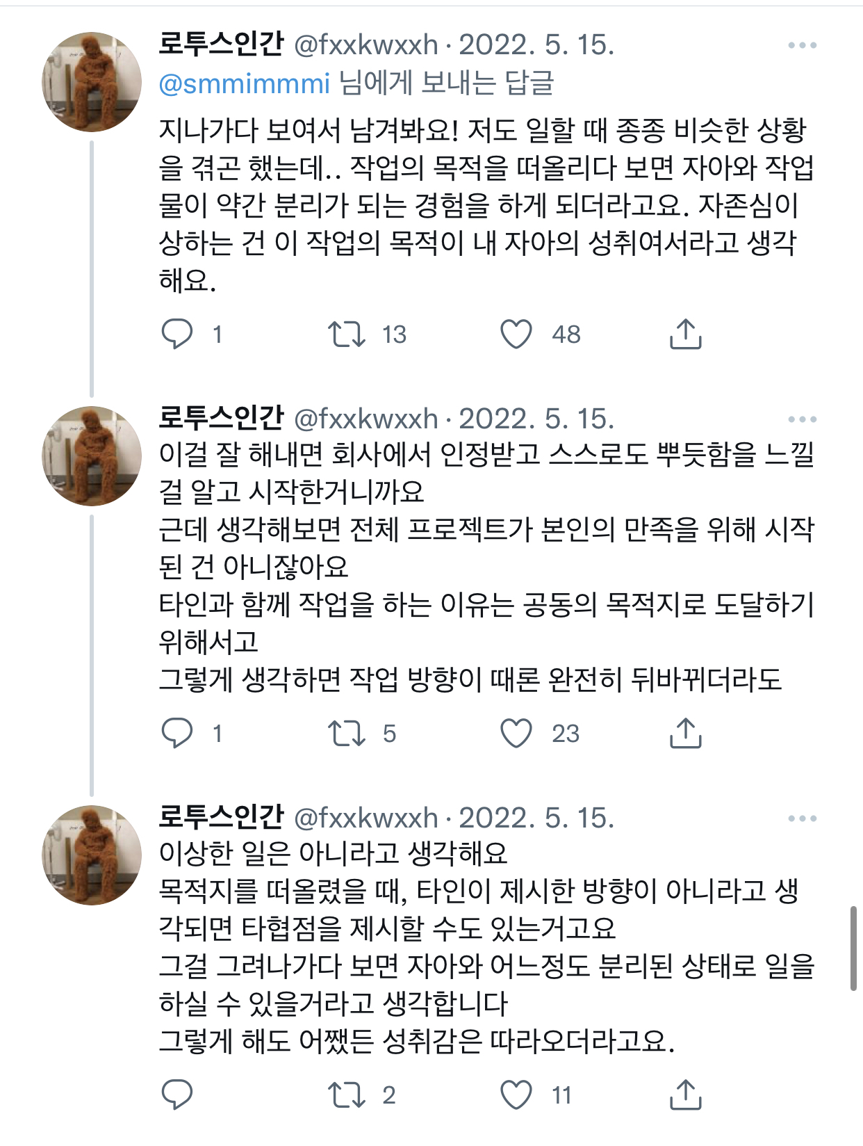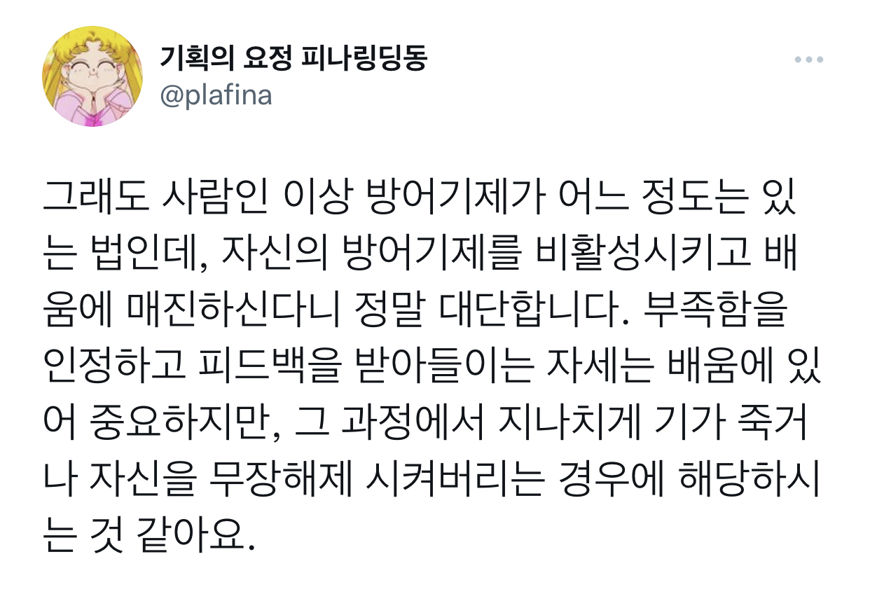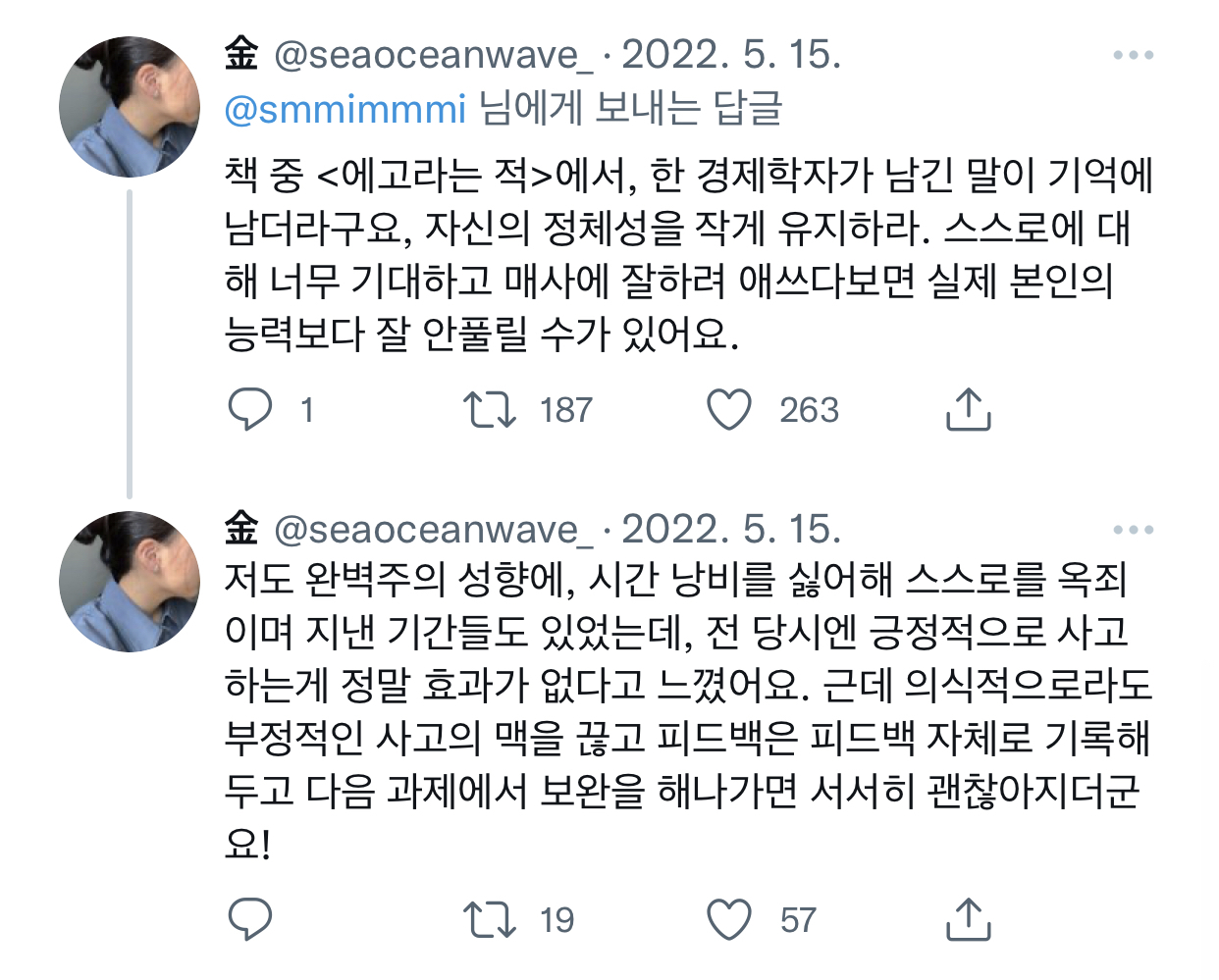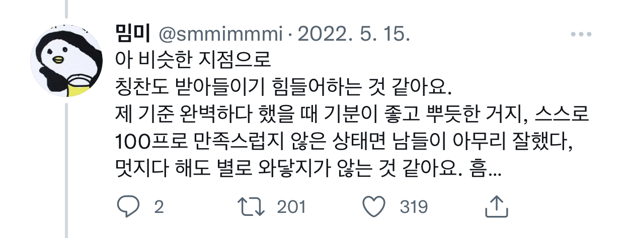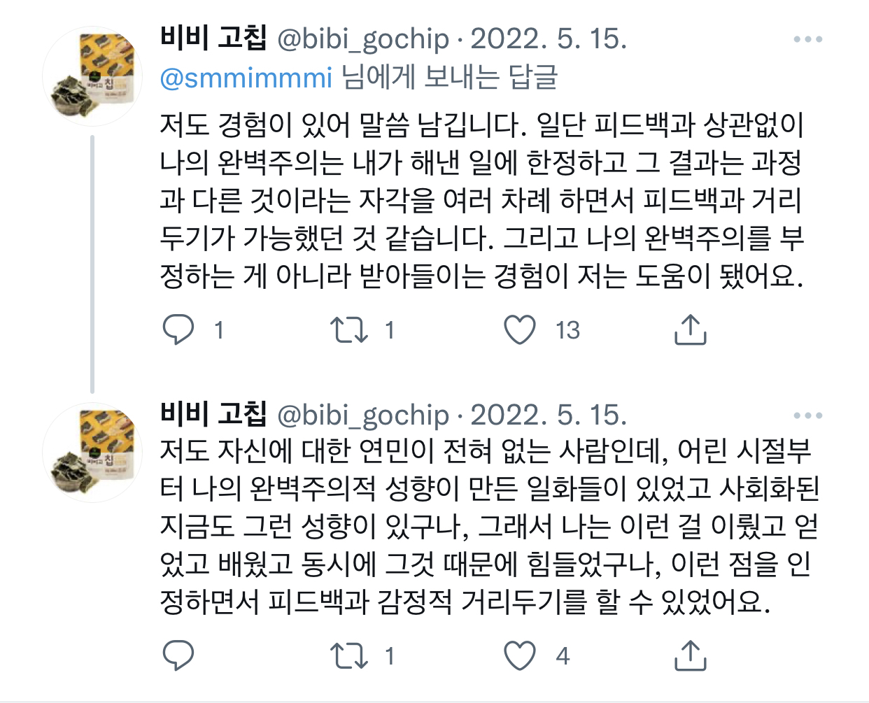 이건 내가 진짜 공감돼서 캡처했어 내가 만족이 안 된 상태에서는 무슨 칭찬을 들어도 '겨우 이정도 가지고 잘했다고?' 싶으니까 "아 아니에요~~ ㅎㅎ;;" 같은 대답 나오고