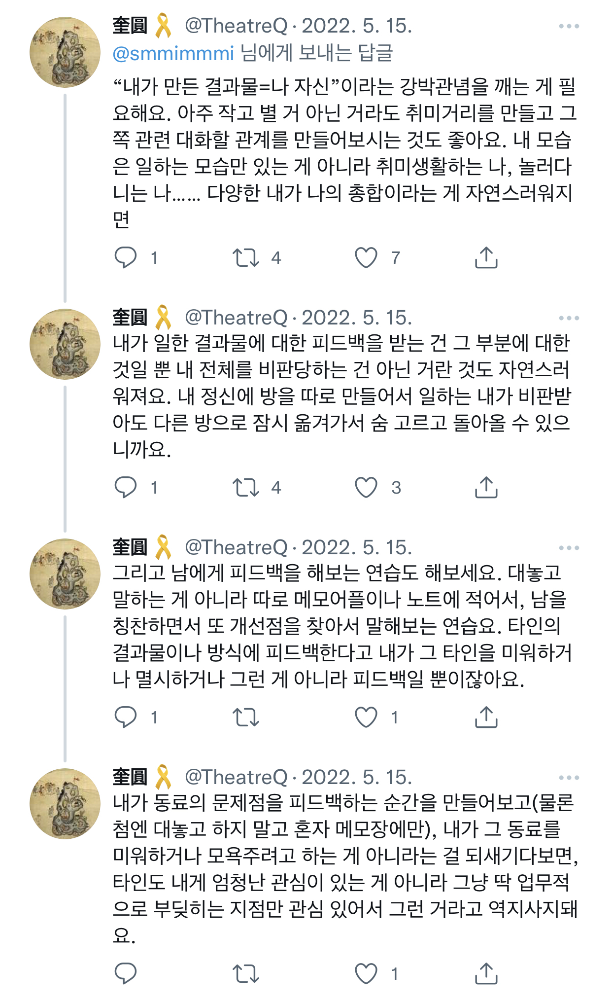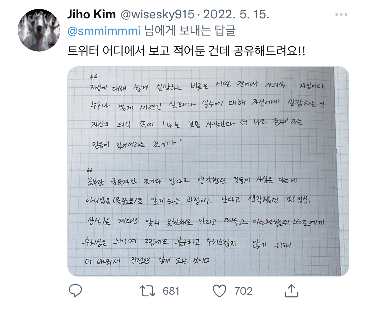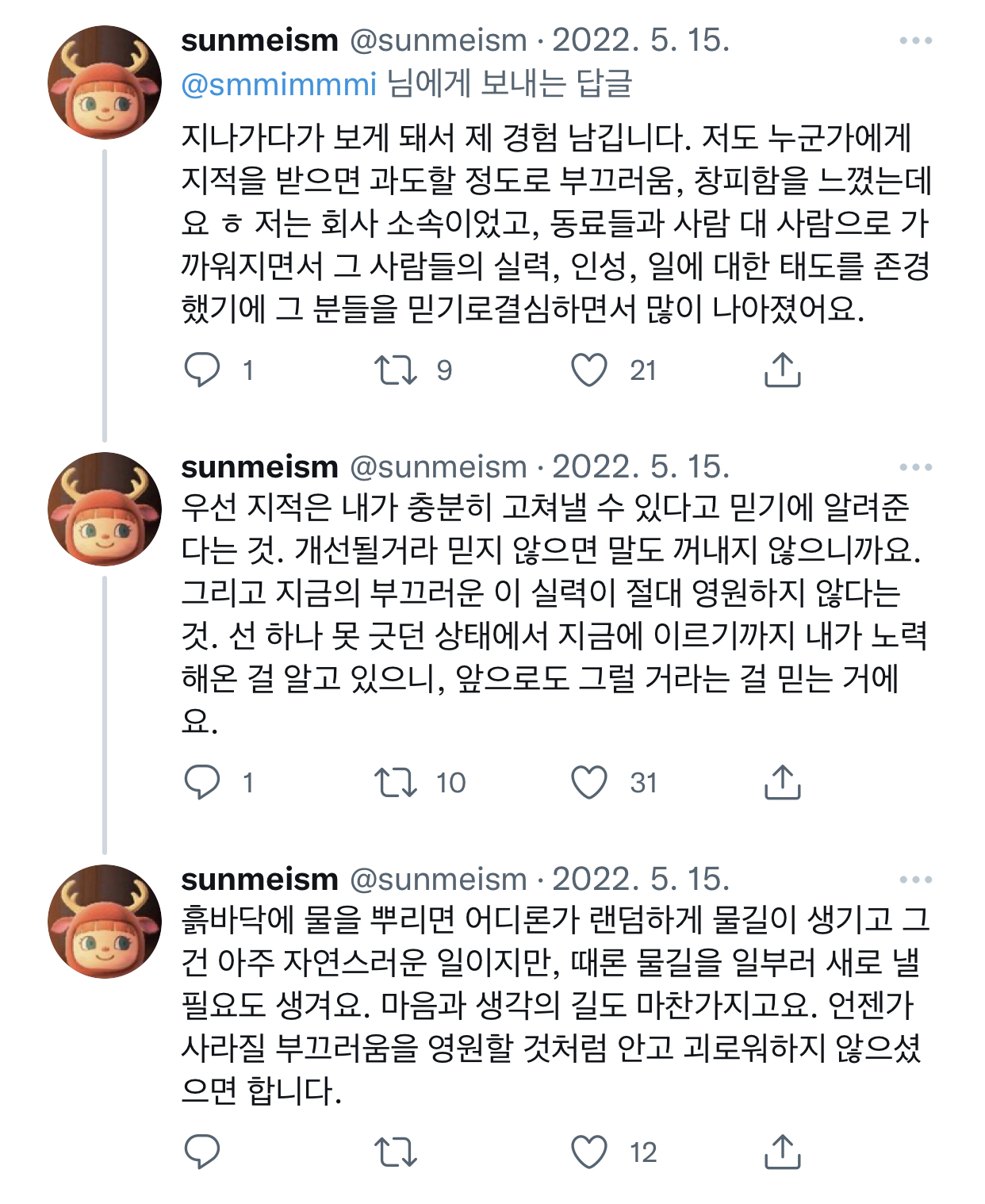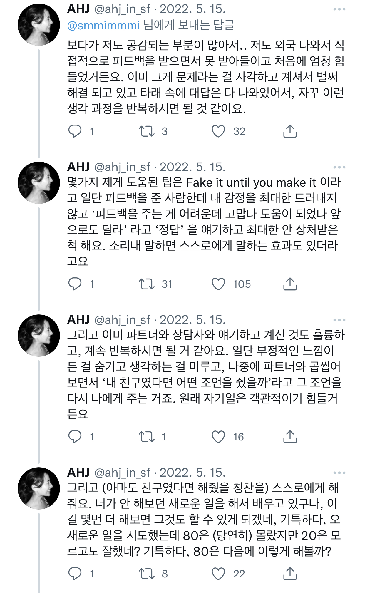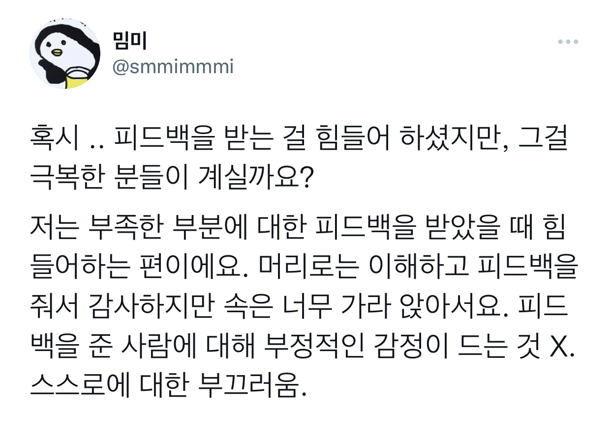 이건 내가 진짜 공감돼서 캡처했어 내가 만족이 안 된 상태에서는 무슨 칭찬을 들어도 '겨우 이정도 가지고 잘했다고?' 싶으니까 "아 아니에요~~ ㅎㅎ;;" 같은 대답 나오고