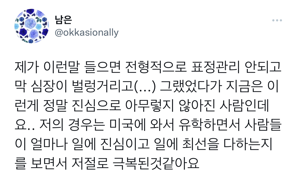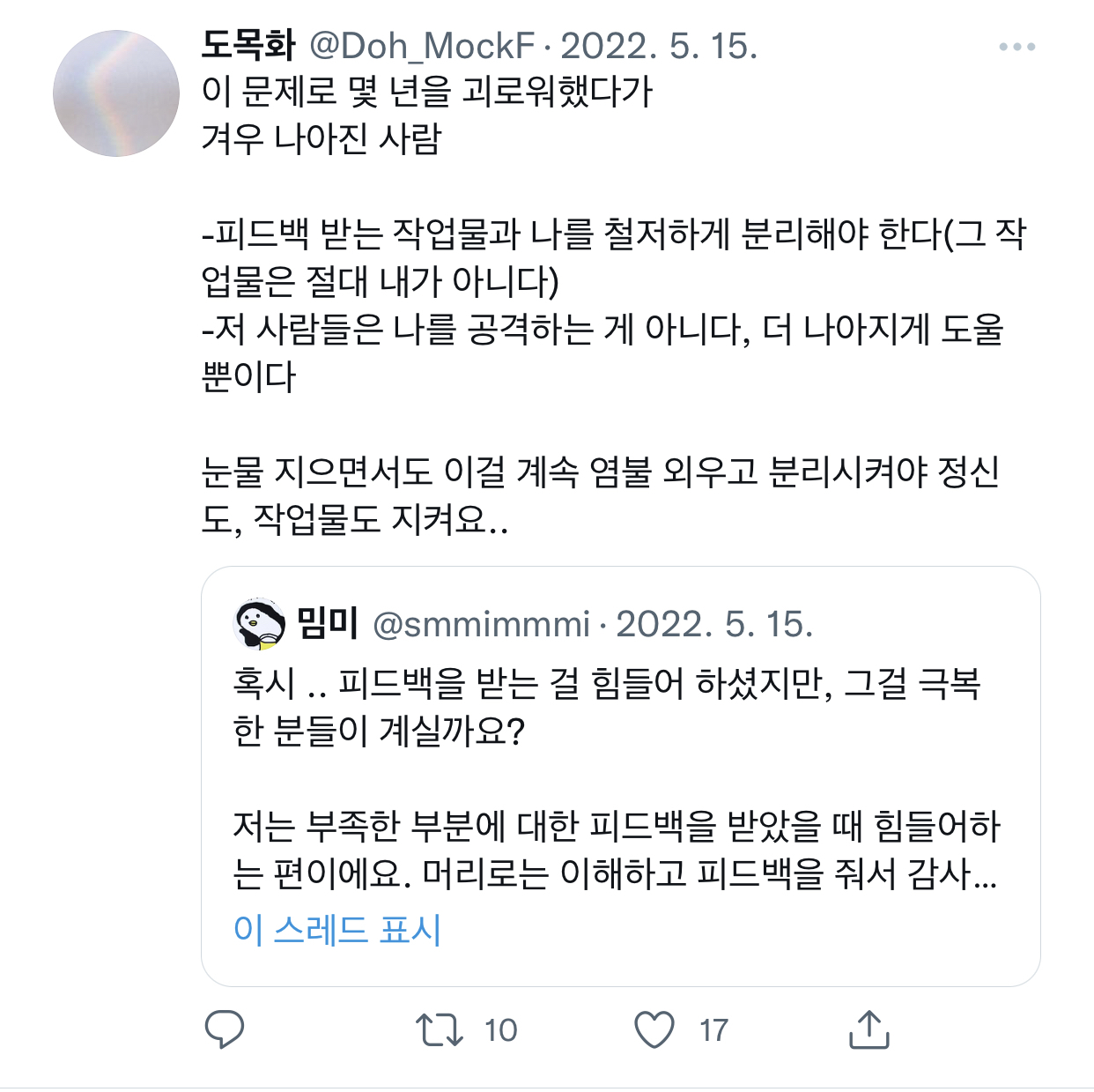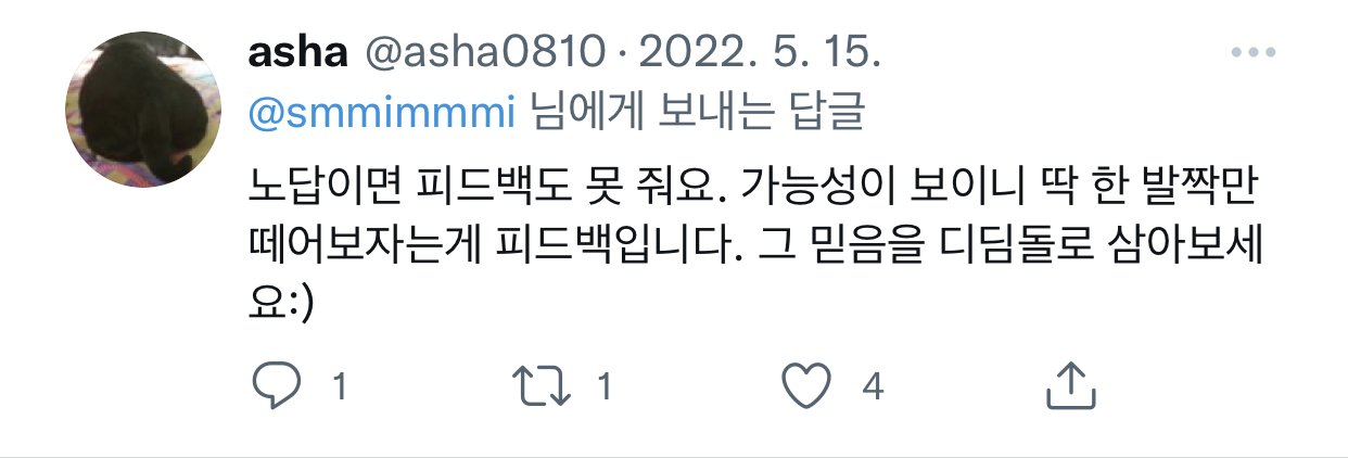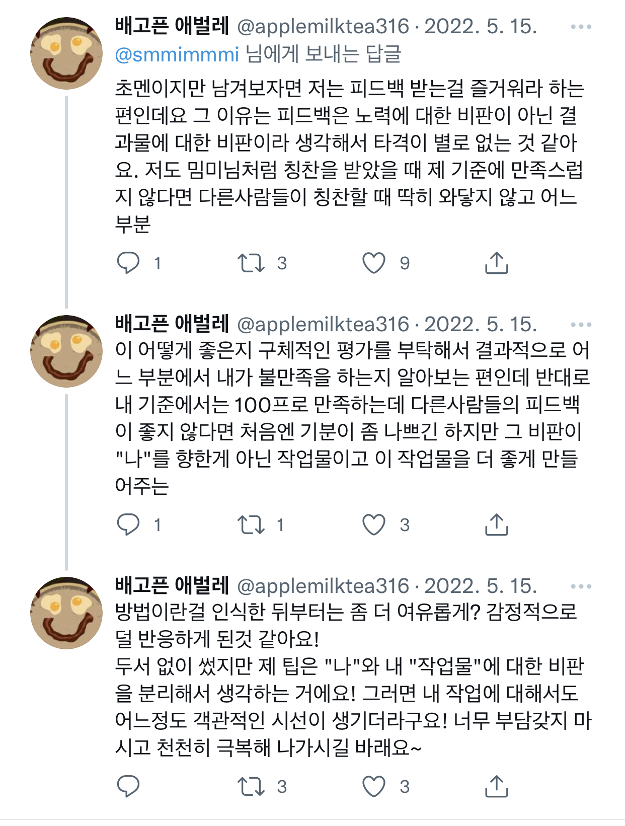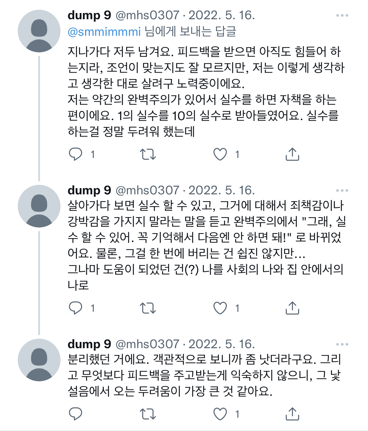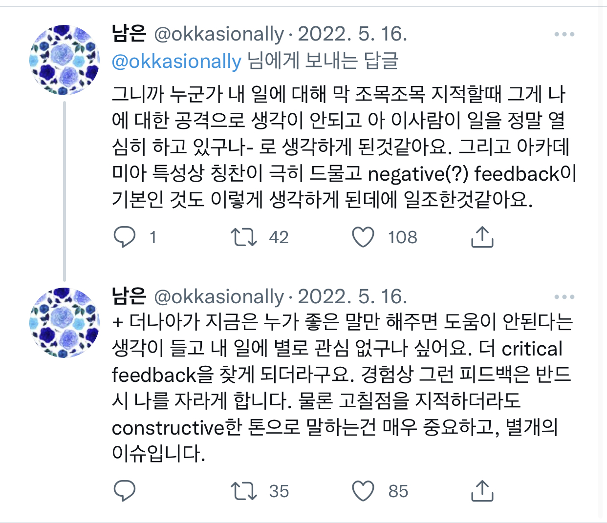 이건 내가 진짜 공감돼서 캡처했어 내가 만족이 안 된 상태에서는 무슨 칭찬을 들어도 '겨우 이정도 가지고 잘했다고?' 싶으니까 "아 아니에요~~ ㅎㅎ;;" 같은 대답 나오고