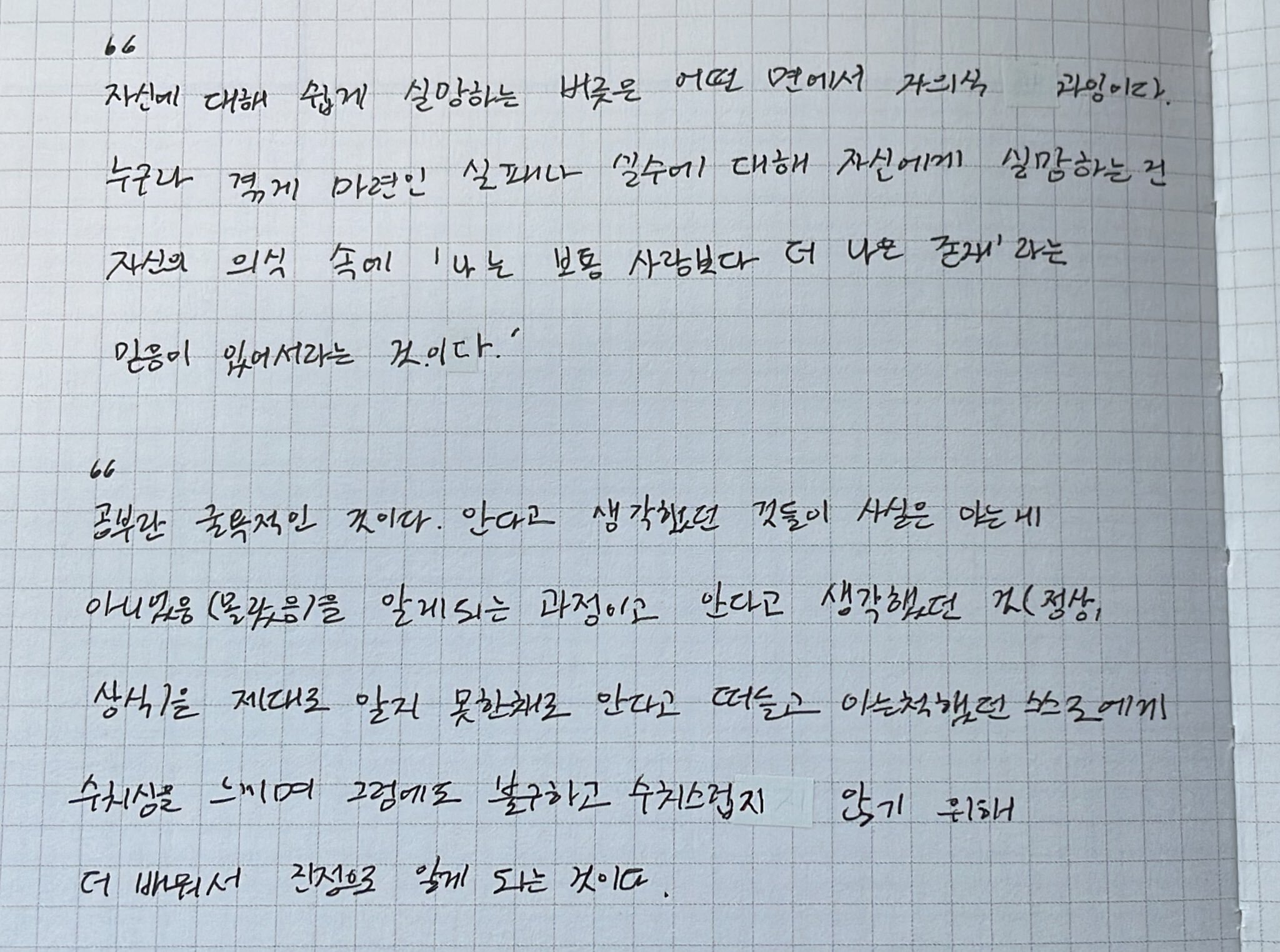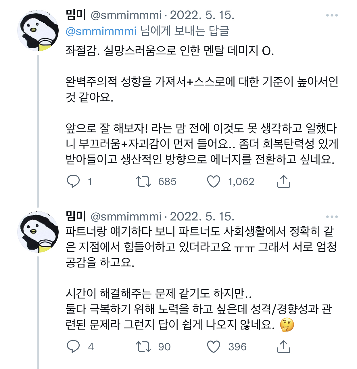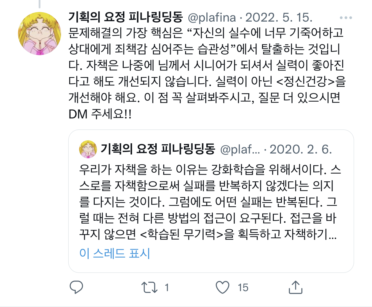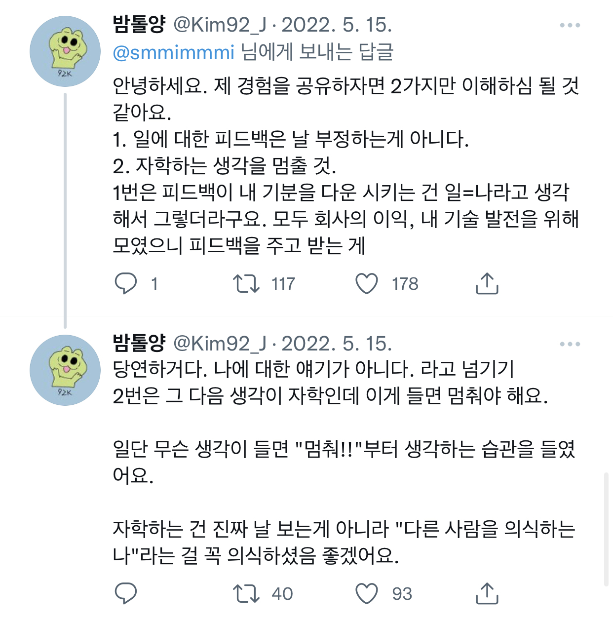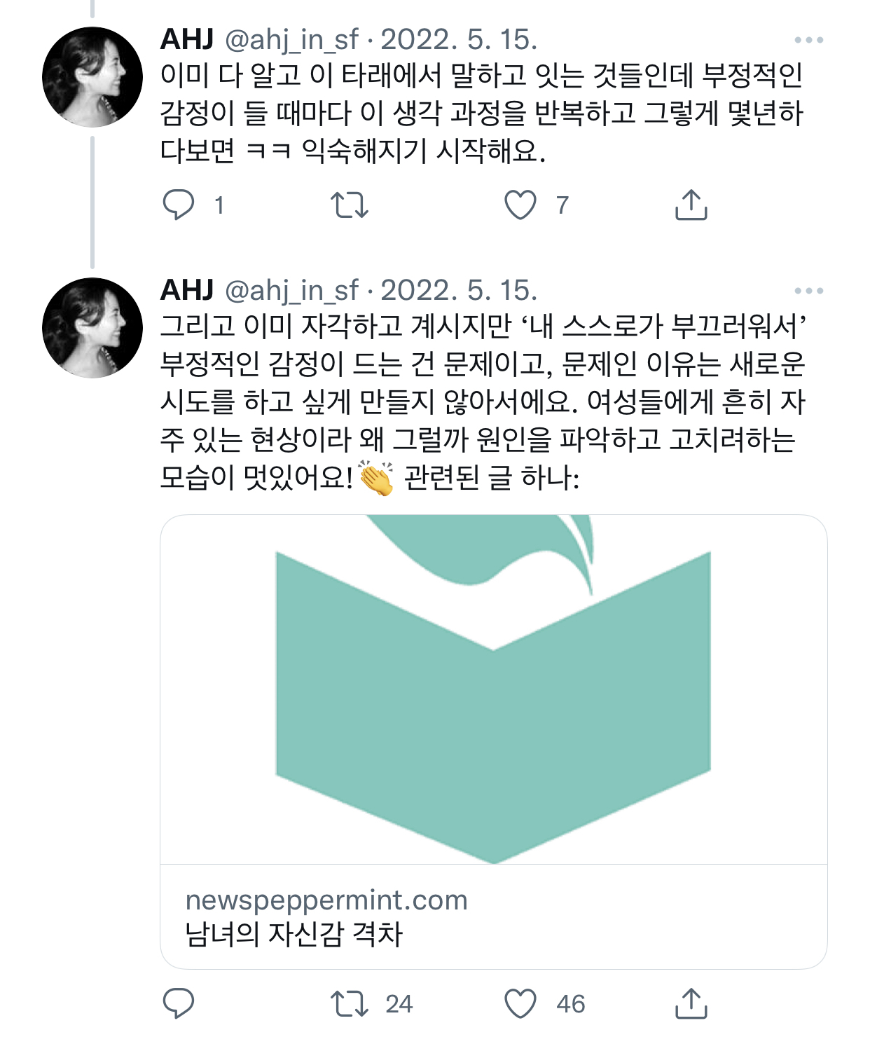 이건 내가 진짜 공감돼서 캡처했어 내가 만족이 안 된 상태에서는 무슨 칭찬을 들어도 '겨우 이정도 가지고 잘했다고?' 싶으니까 "아 아니에요~~ ㅎㅎ;;" 같은 대답 나오고