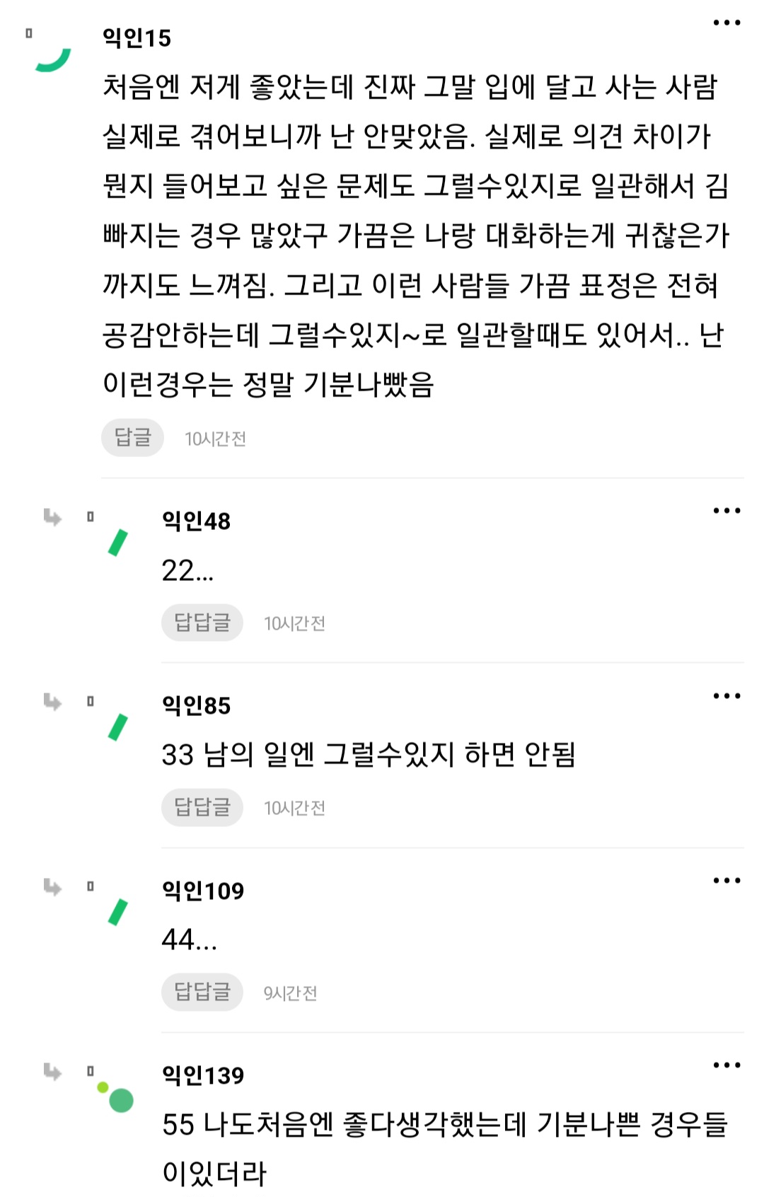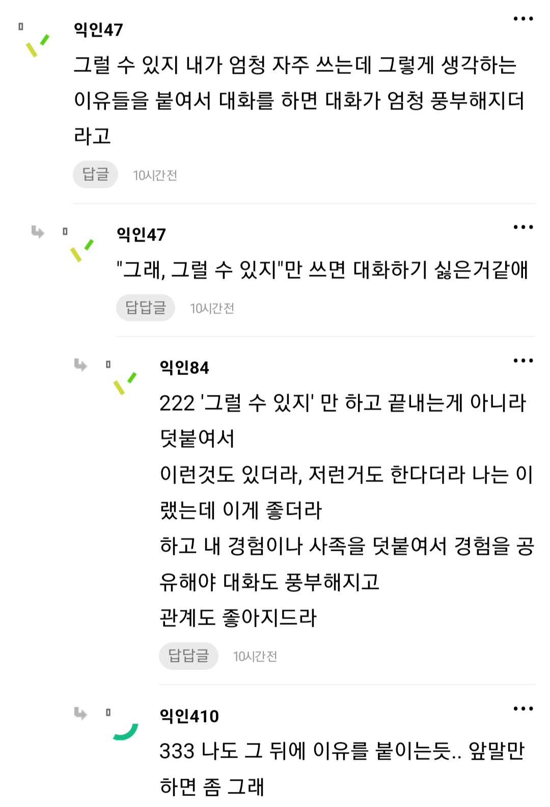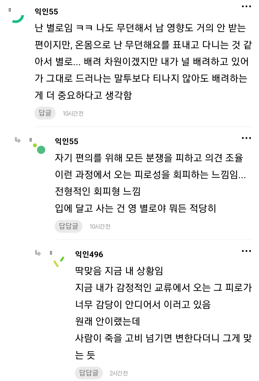 작성자뷁인데요 작성시간 23.10.28 물론 뉘앙스가 중요하지만 자기 의견없이 딱 저 말만 하는 사람이랑은 대화할때 재미가 없어..나도 더이상 그 사람이 어떤 사람인지 안궁금해지고 흥미 떨어짐