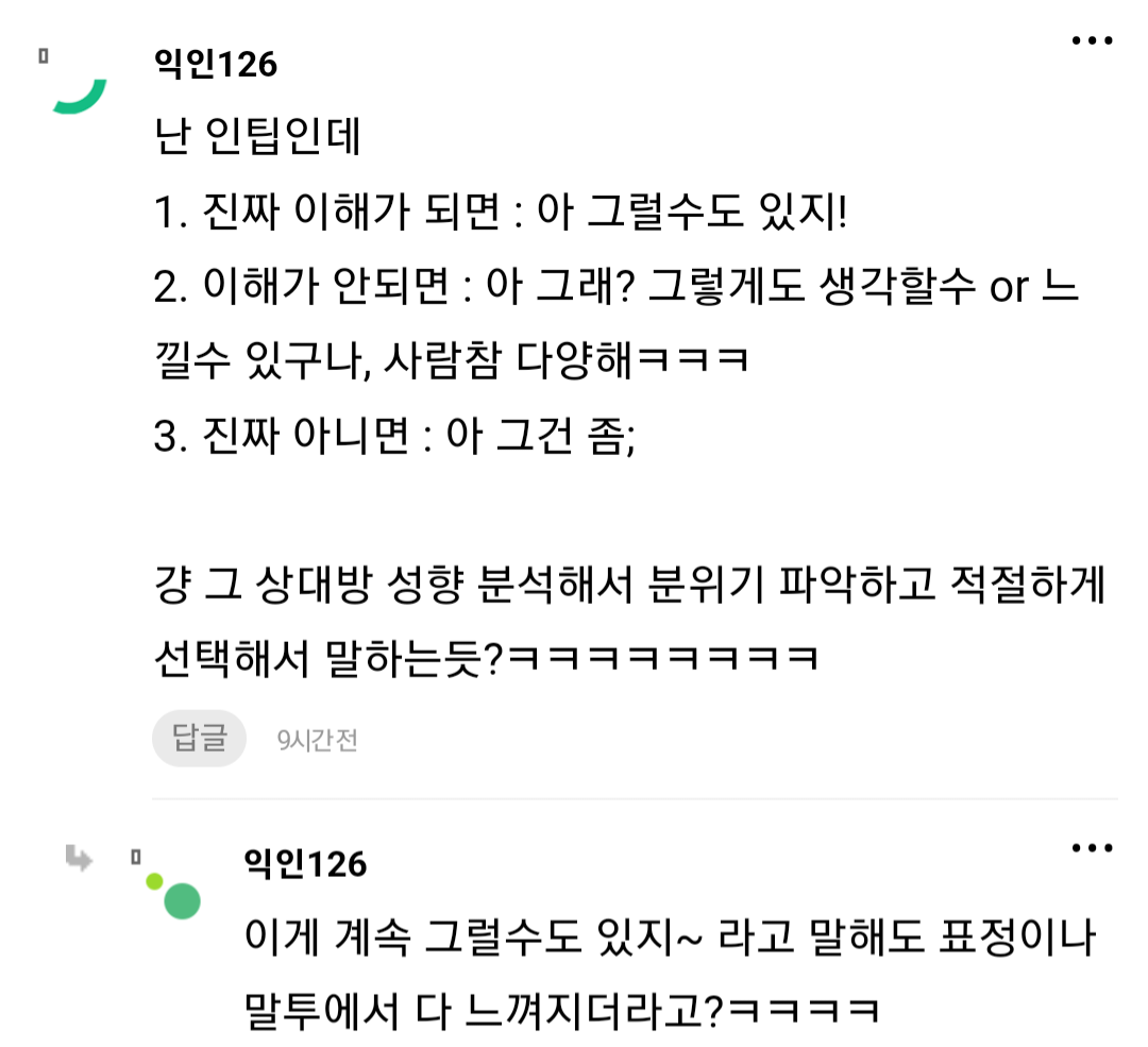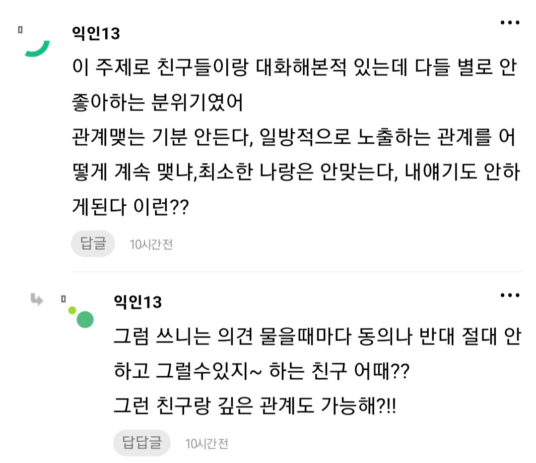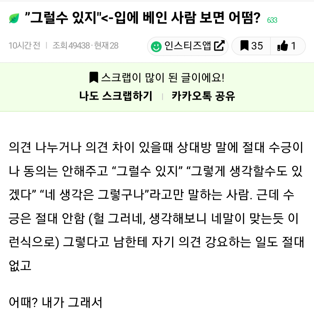 작성자뷁인데요 작성시간 23.10.28 물론 뉘앙스가 중요하지만 자기 의견없이 딱 저 말만 하는 사람이랑은 대화할때 재미가 없어..나도 더이상 그 사람이 어떤 사람인지 안궁금해지고 흥미 떨어짐