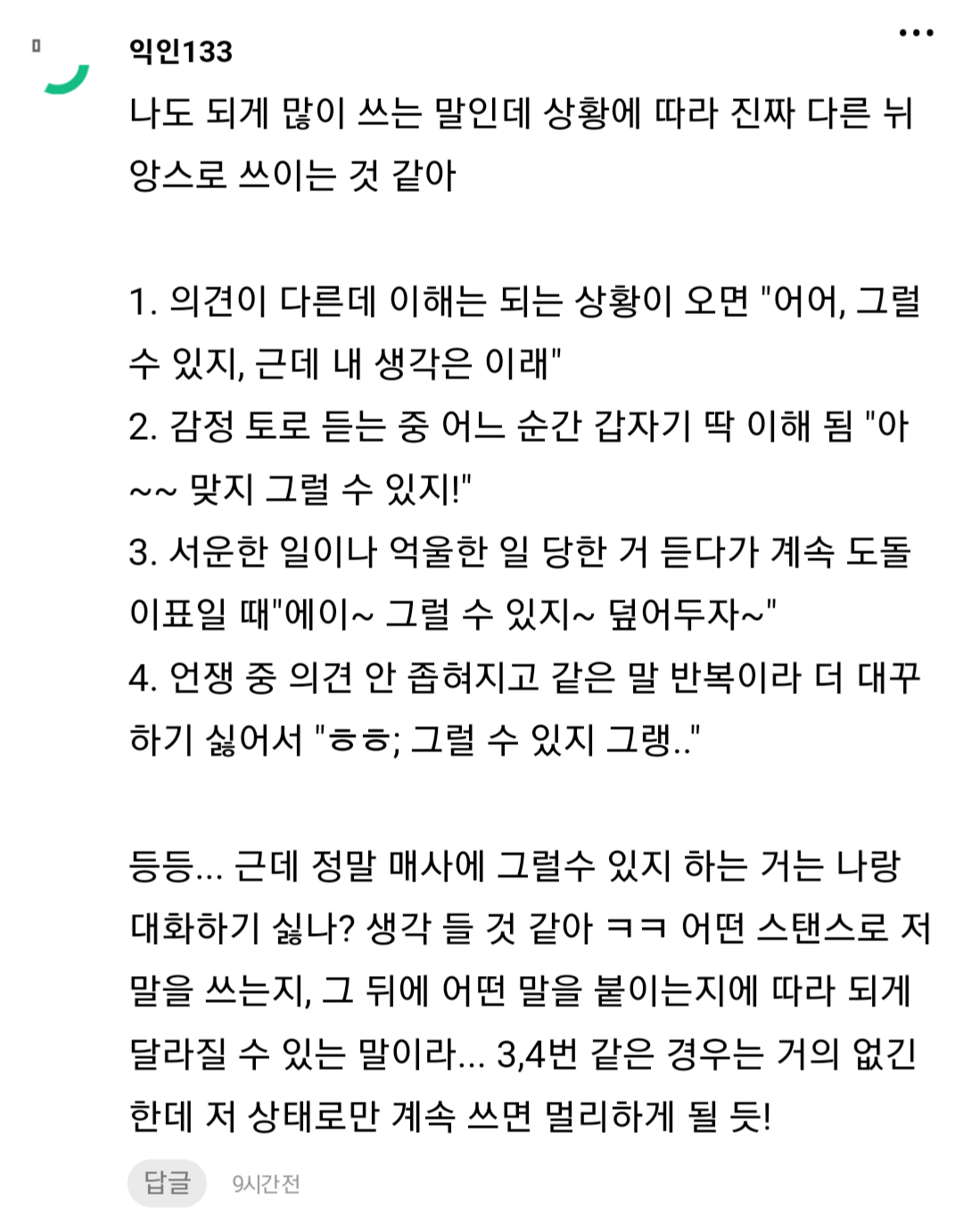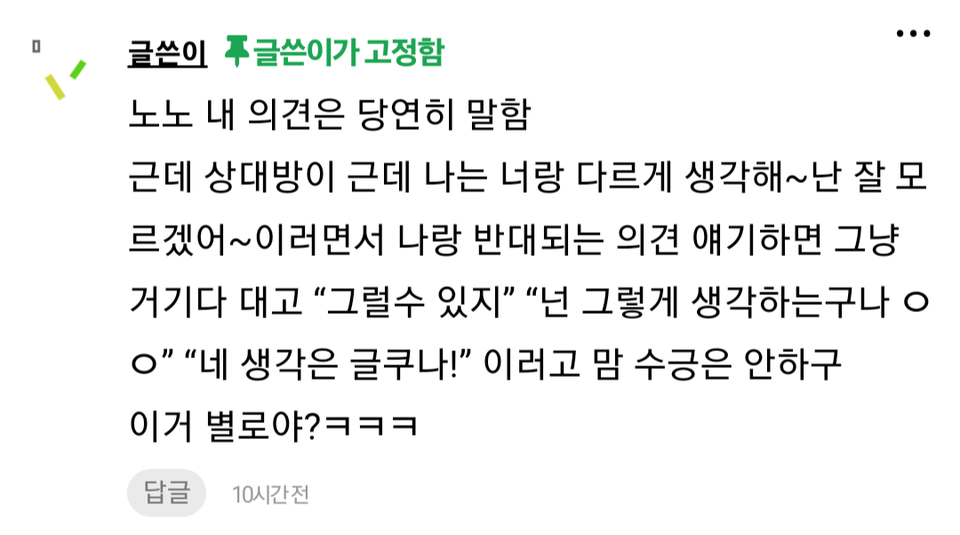 작성자지나가는엔팁 작성시간 23.10.28 나 진짜 자주 쓰는데ㅋㅋㅋㅋ 자기주장 강한 애들 앞에서 특히 많이씀ㅎㅎ 대꾸해주기 힘들고 귀찮을때ㅎ