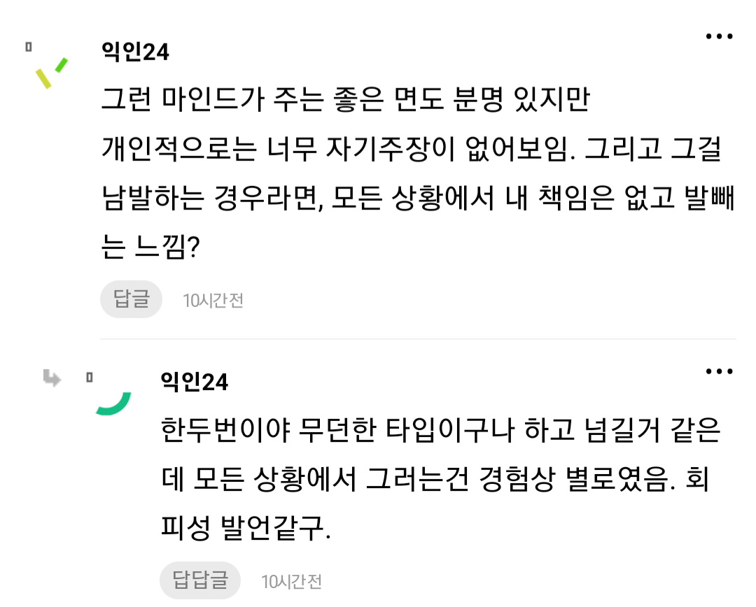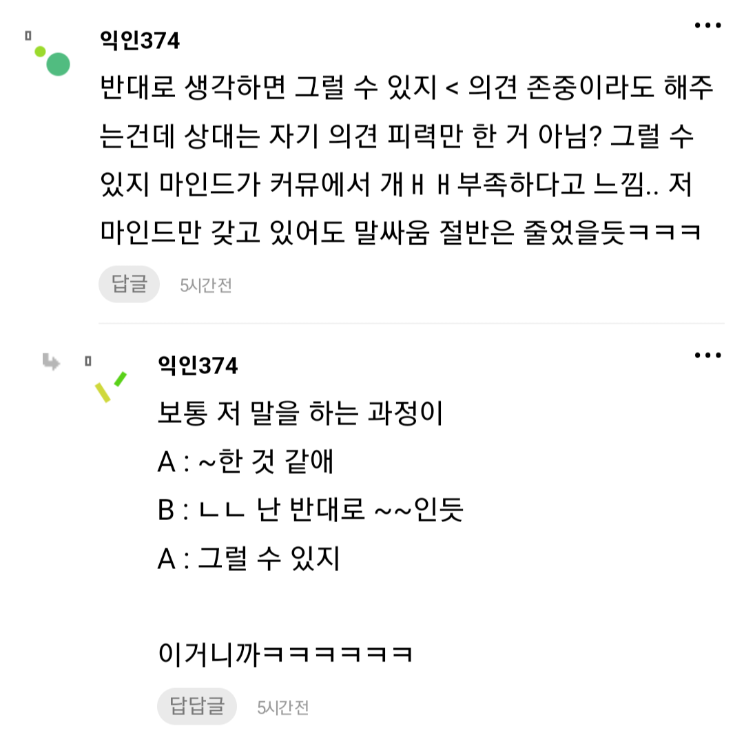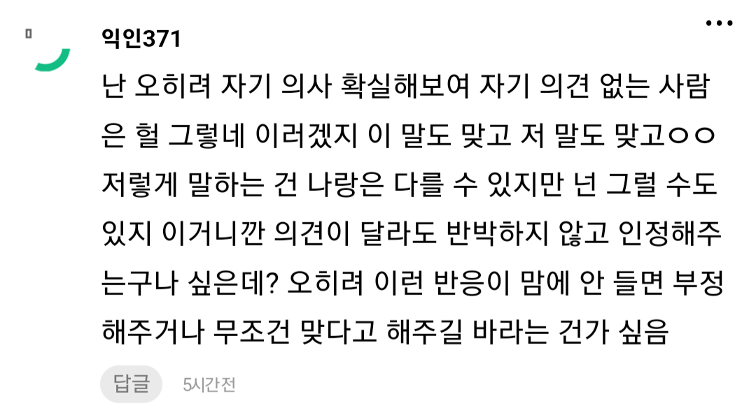 이런 애들 특징이 네 의견도 맞는 것 같지만~ 이 아니라 네 의견보다 내 의견이, 네 의견엔 이런 모순이 이런 식으로 토론이 아니라 내 의견 짓밟기에 가까워서 그냥 일찍 끝냄.. 건강한 대화를 할 수 없는 사람한테 주로 씀.. -