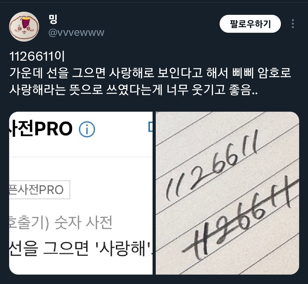 [기타]1126611에 선을 그으면 사랑해로 보인다고 해서 삐삐 암호로 사랑해라는 뜻으로 쓰였다는 게 너무 웃기고 좋음.. 작성자구현|작성시간23.12.28|조회수8,120 목록 댓글 8 글자크기 작게가 글자크기 크게가 다음카페 우리 동네 목욕탕https://twitter.com/vvvewww/status/1586737431998771201?t=DTSjpV5jgldSh5wm8WPHuA&s=19 다음검색 현재 게시글 추가 기능 열기 북마크 공유하기 신고 센터로 신고 댓글 댓글 8 댓글쓰기 답글쓰기 댓글 리스트 작성자히히똥오줌발싸 | 작성시간 23.12.28 미쳤다 작성자entp | 작성시간 23.12.28 우와내생일이다 작성자호떡호떡 | 작성시간 23.12.28 17171771도 있잖아 I LUV U 다들 기발해 작성자족팔려 | 작성시간 23.12.28 112611 작성자I love you in every universe. | 작성시간 23.12.28 17171771 댓글 전체보기