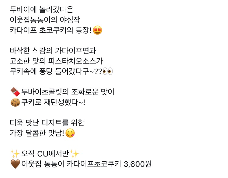 우리 동네 목욕탕 [기타]두바이 스타일 초콜릿에 이어 나오는 씨유 이웃집 통통이 두바이식 초코쿠키.jpg 작성시간24.07.09|조회수14,439 목록 댓글 10 글자크기 작게가 글자크기 크게가 《 우리 동네 목욕탕 / 출소 후 우동탕이 유일한 낙입니다 》 과연..7/17 출시 예정 다음검색 현재 게시글 추가 기능 열기 북마크 공유하기 신고 센터로 신고 댓글 10 댓글 리스트 작성시간 24.07.09 드디어 !!!!!! 작성시간 24.07.09 오 ㄷㅂ 작성시간 24.07.10 아 또 준초콜렛이잔아요~~~ 작성시간 24.07.10 카다이프면이라니 기대해보겠어.. 씨유 두바이식 초콜렛 노맛이라던데 작성시간 24.07.13 와 오늘 갠카에서 6천원주고ㅠ사먹엇는데 절반이네 카페 방문해 더 많은 댓글 만나기!