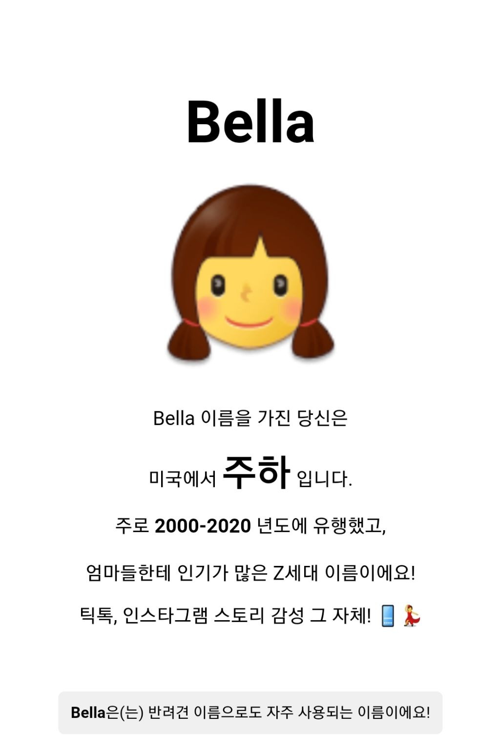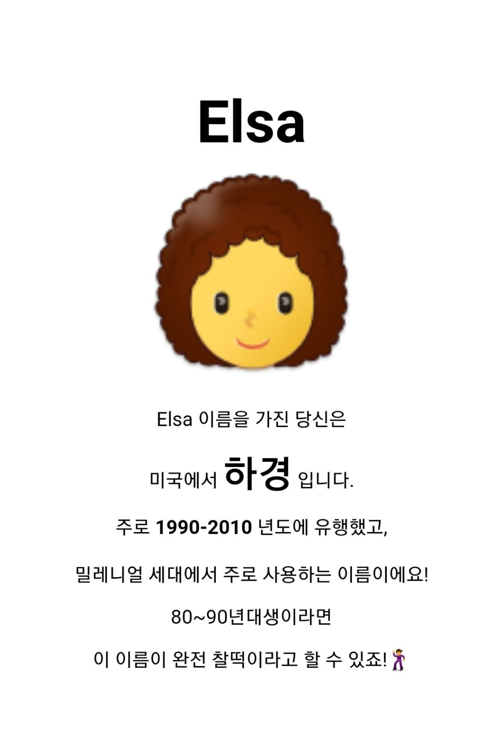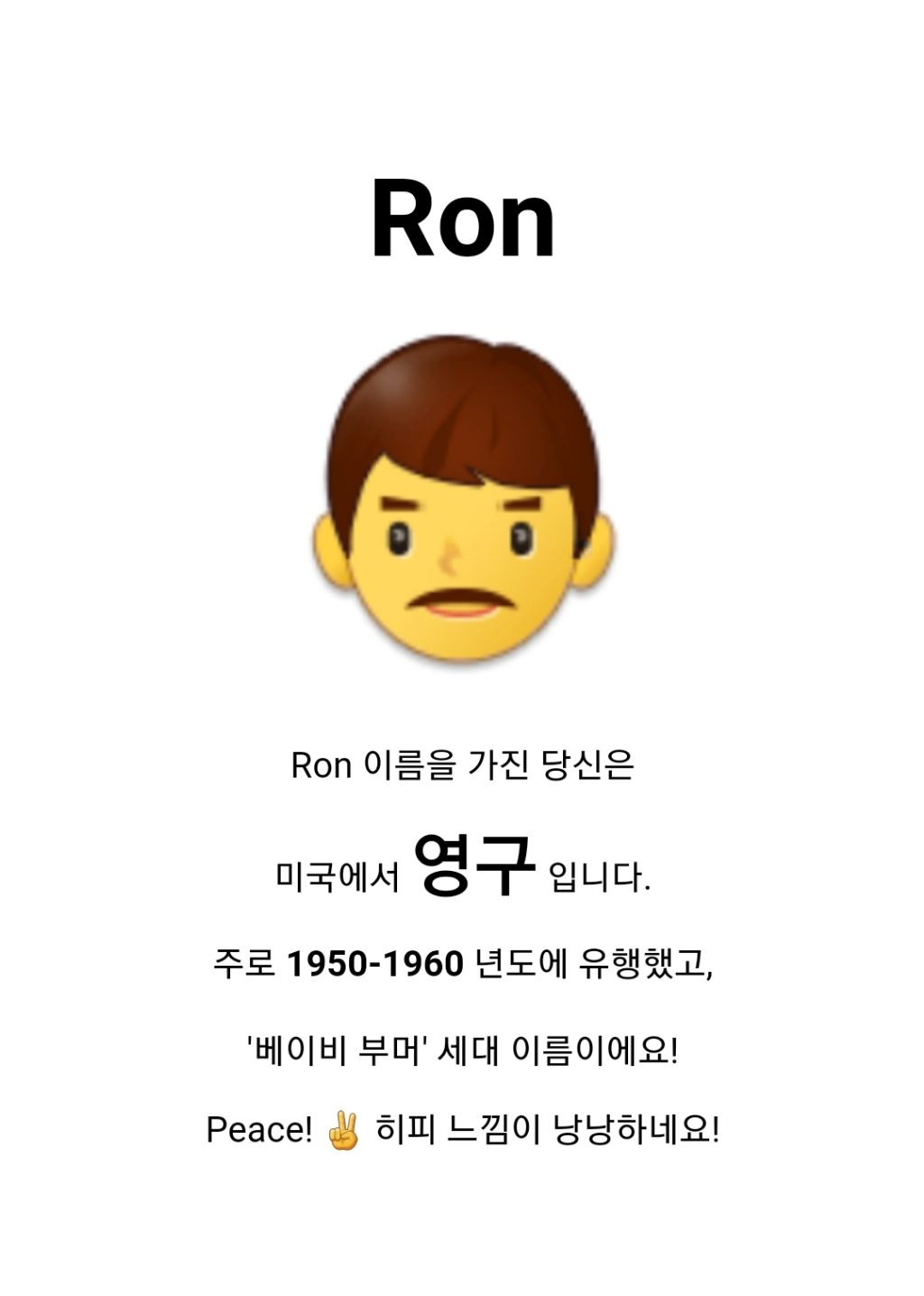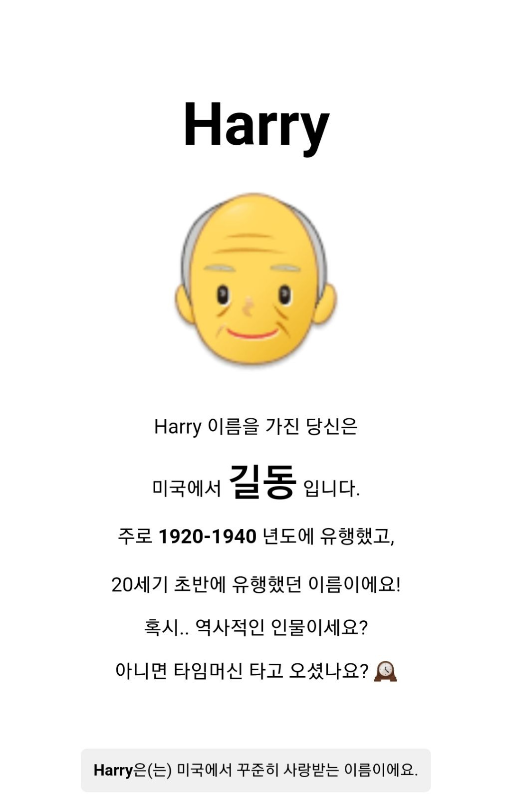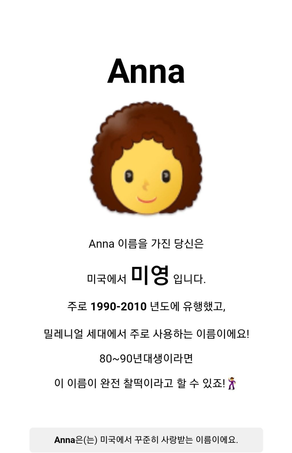 [기타]영어이름 검색하면 한국이름 알려주는 사이트 작성자화이트코코|작성시간24.07.31|조회수10,715 목록 댓글 74 글자크기 작게가 글자크기 크게가 《 우리 동네 목욕탕 / 화이트코코 》 https://chunja.vercel.app/내가 춘자라니Anne이 미국에선 춘자라고? 내가 춘자라니! 내 영어 이름이 미국에서 촌스러운 이름인지, 트렌디한 이름인지 알아보기! 이름의 유행 연도도 알 수 있어요ㅎㅎchunja.vercel.app어느 세대 느낌인지 알려줘서 좋은듯 다음검색 현재 게시글 추가 기능 열기 북마크 공유하기 신고 센터로 신고 댓글 댓글 74 댓글쓰기 답글쓰기 댓글 리스트 작성자조말론 | 작성시간 24.07.31 용례 ㅁㅊ 작성자토미에 | 작성시간 24.07.31 은경이? 작성자1H5m | 작성시간 24.08.01 해인 ㅎㅎ Riley 작성자우리돼지 | 작성시간 24.08.02 나린 ㅋㅋㅋ 작성자농담곰2 | 작성시간 24.08.07 춘복잌ㅋㅋㅋ 댓글 전체보기