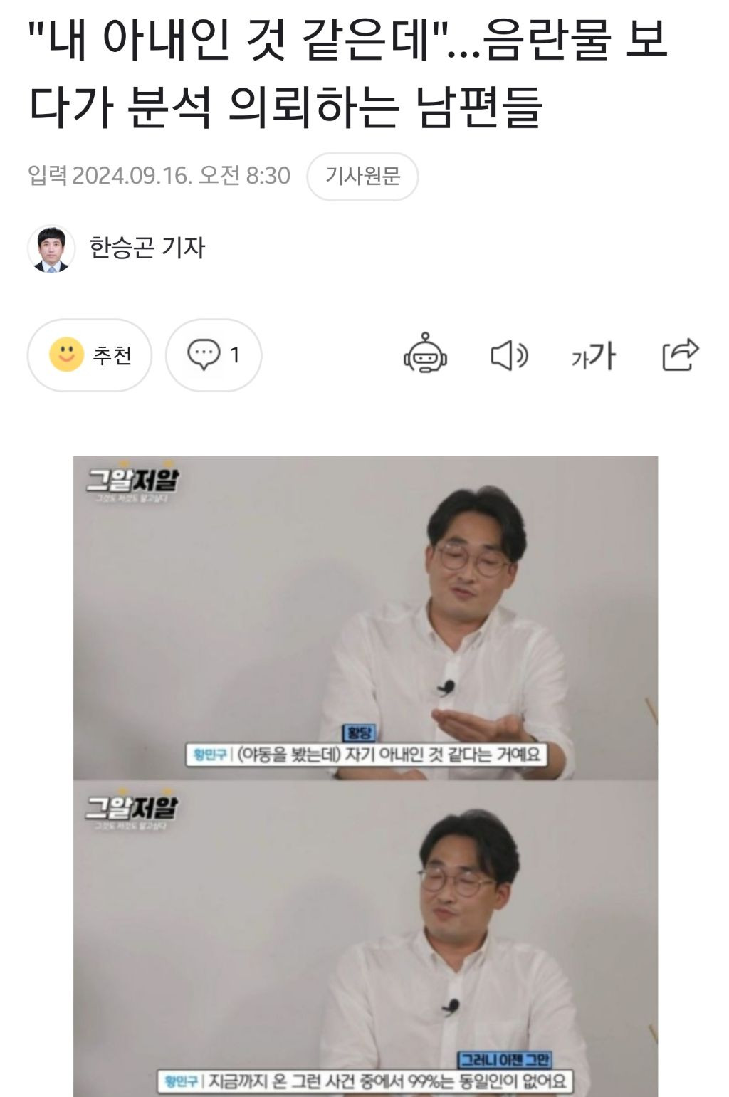 16일 여러 온라인 커뮤니티에는 '포르노 보다가 자기 부인인지 확인해달라며 찾아온다는 남편들'이라는 제목의 글이 올라왔다. 해당 게시글은 2021년 '그것이 알고 싶다' 유튜브 채널에 출연한 법 영상 분석가 황민구 소장의 일화를 소개한 영상의 내용을 담고 있었다.
