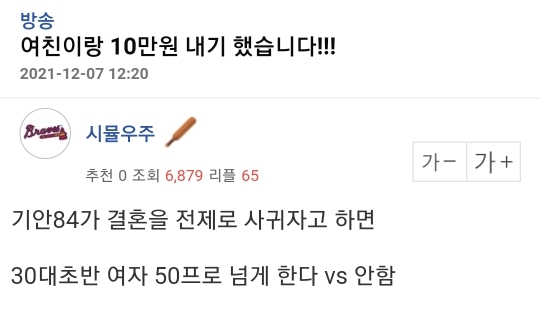 [스크랩] [기타]"기안84가 결혼을 전제로 사귀자고 하면 30대 초반 여자들 결혼한다vs안한다"로 싸우는 엠팍남🤮 작성자허걱|작성시간22.07.27|조회수2,885 목록 댓글 86 글자크기 작게가 글자크기 크게가 http://mlbpark.donga.com/mp/b.php?p=1&b=bullpen&id=202112070063224979&select=&query=&user=&site=&reply=&source=&pos=&sig=h4a9SY2Ak3HRKfX2h6jXGg-Y5mlq 다음검색 스크랩 원문 : 우리 동네 목욕탕 현재 게시글 추가 기능 열기 북마크 공유하기 신고 센터로 신고 댓글 댓글 86 댓글쓰기 답글쓰기 댓글 리스트 작성자lVE 안유진 | 작성시간 22.07.27 웅 니 기안닮음 작성자무사와요가뭐니무사오세요라고해야지 | 작성시간 22.07.27 𝒮𝒾𝒷𝒶𝓁 ㅋㅋㅋㅋ 작성자정혁 | 작성시간 22.07.27 으 작성자건강체 | 작성시간 22.07.27 니들이나 해라 작성자델마와 루이스 | 작성시간 22.07.27 너네 가져,,,,, 댓글 전체보기