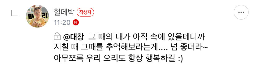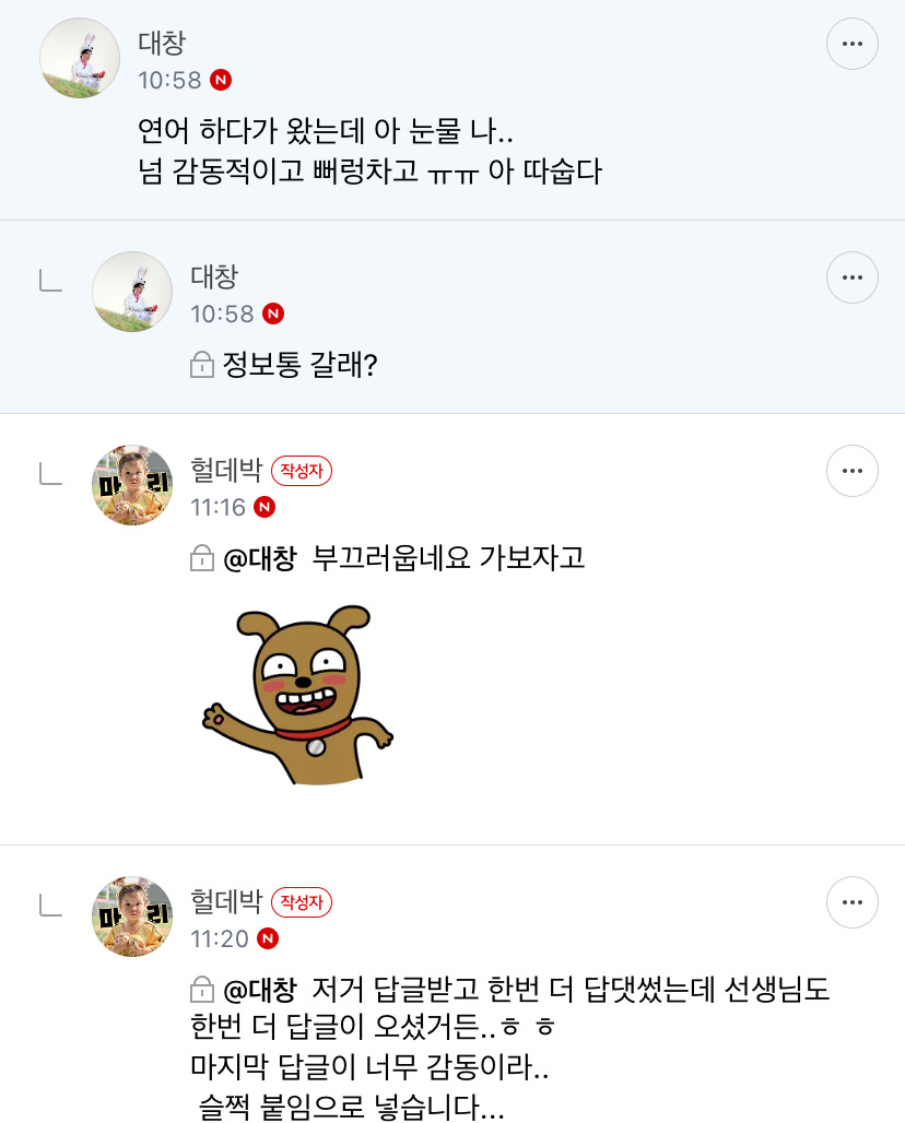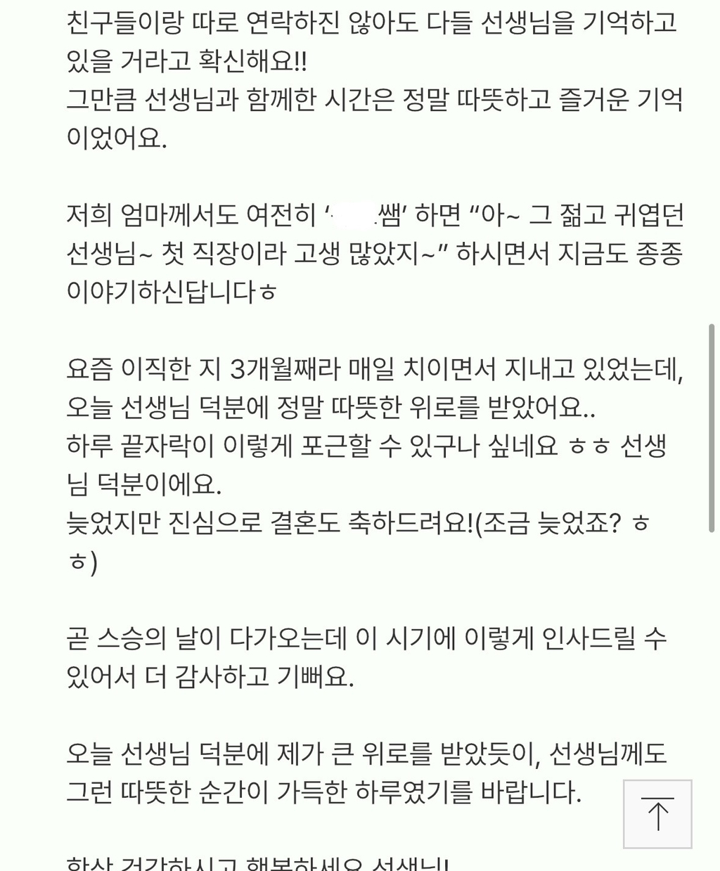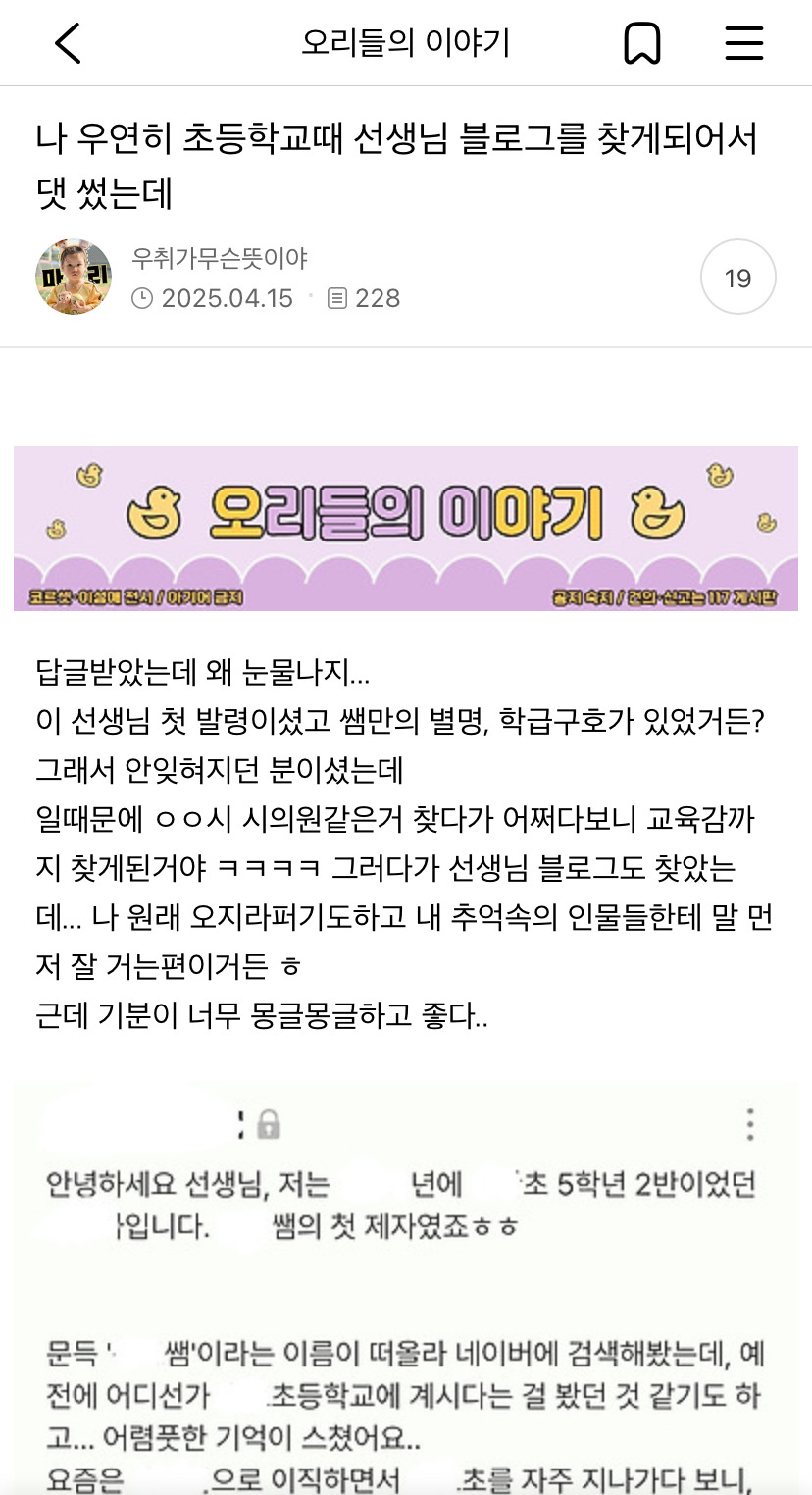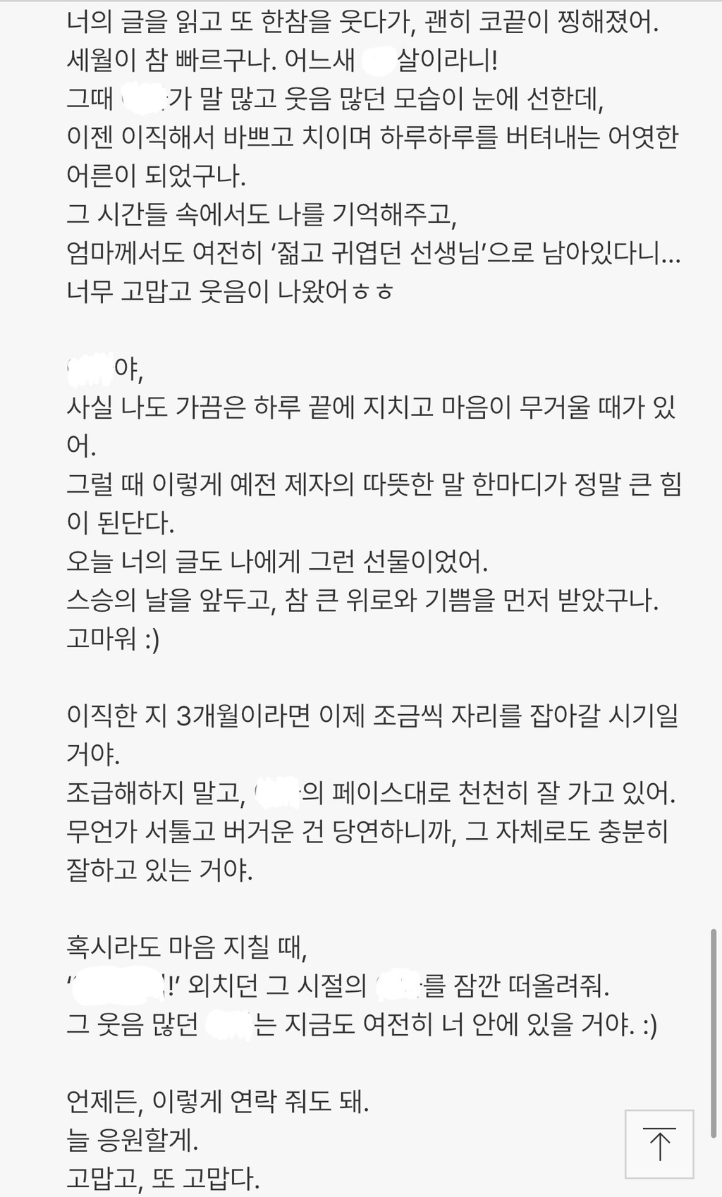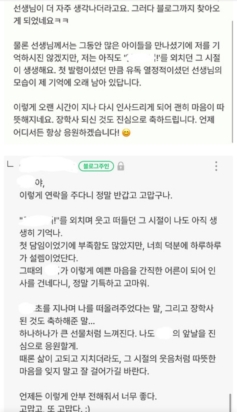 [감동/눈물]나 우연히 초등학교때 선생님 블로그를 찾게되어서 댓 썼는데.oyagi 작성자대창|작성시간25.04.20|조회수2,591 목록 댓글 30 글자크기 작게가 글자크기 크게가 《 우리 동네 목욕탕 / 대창 》 +보다가 나도 눈물 엄청 훔쳤네지친 오리들도 잠시나마힐링하고 갔음 좋겠다 🕊️허락해준 오리도 항상 행복하고이 글 보는 오리들도 항상 행복하자🩵 다음검색 현재 게시글 추가 기능 열기 북마크 공유하기 신고 센터로 신고 댓글 댓글 30 댓글쓰기 답글쓰기 댓글 리스트 작성자체크블루 | 작성시간 25.04.20 눈물 줄줄.. 따숩다 작성자dkoddpn | 작성시간 25.04.20 아 눈물나 너무 감동이야... 작성자소복한 눈 위로 겨울 감이 톡 | 작성시간 25.04.20 눈물 작성자다람쥐고라니 | 작성시간 25.04.20 너무 낭만잇쟈냐… 작성자힝구여요 | 작성시간 25.04.21 몽글몽글해... 댓글 전체보기