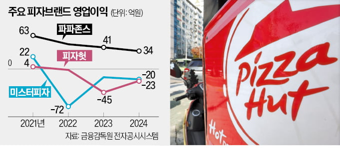 2일 금융감독원 전자공시 시스템에 따르면 피자헛은 지난해 23억원의 영업손실을 냈다. 전년(-45억원)보다 줄긴 했지만 3년 연속 적자행진을 이어갔다. 지난해 미스터피자(-20억원) 피자알볼로(-3억원) 등도 적자를 냈다.