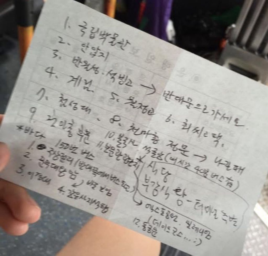 생각해둔 코스 읊어드렸더니 신호걸린 틈을 타 종이에 뭔갈 막 적으심