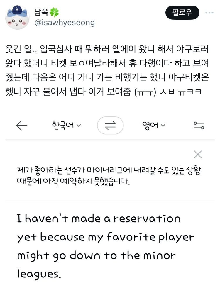 [유머]웃긴 일.. 입국심사 때 뭐하러 엘에이 왔니 해서 야구보러 왔다 했더니.twt 작성자출소 후 우동탕이 유일한 낙입니다|작성시간25.05.20|조회수8,375 목록 댓글 6 글자크기 작게가 글자크기 크게가 《 우리 동네 목욕탕 / 출소 후 우동탕이 유일한 낙입니다 》 https://x.com/isawhyeseong/status/1924632572791030032?s=46&t=qwUKrvyd8DoOTCv7KDJf2AX의 남옥🍀님(@isawhyeseong)웃긴 일.. 입국심사 때 뭐하러 엘에이 왔니 해서 야구보러 왔다 했더니 티켓 보ㅇ여달라해서 휴 다행이다 하고 보여줬는데 다음은 어디 가니 가는 비행기는 했니 야구티켓은 했니 자꾸 물어서 x.com 다음검색 현재 게시글 추가 기능 열기 북마크 공유하기 신고 센터로 신고 댓글 댓글 6 댓글쓰기 답글쓰기 댓글 리스트 작성자귤현동 왕주먹에 캔디 하나 | 작성시간 25.05.20 𝙎𝙄𝘽𝘼𝙇 ㅋㅋㅋㅋㅋㅋㅋ 작성자떠나요 | 작성시간 25.05.20 그만 물어보시라고요 ㅜㅜㅋㅋㅋㅋㅋㅋㅋ 작성자까다로운 도토리 | 작성시간 25.05.20 혜성이 보려 갔나? 작성자라이크 재기 | 작성시간 25.05.20 ㅅㅂㅋㅋㅋㅌㅋㅋㅋ웃안웃ㅠ 혜성아 꽉 붙어있어라... 작성자행운이 | 작성시간 25.05.20 아 시발 ㅋㅋㅋㅋㅋㅋㅋㅋㅋㅋㅋㅋㅋㅋㅋ 댓글 전체보기