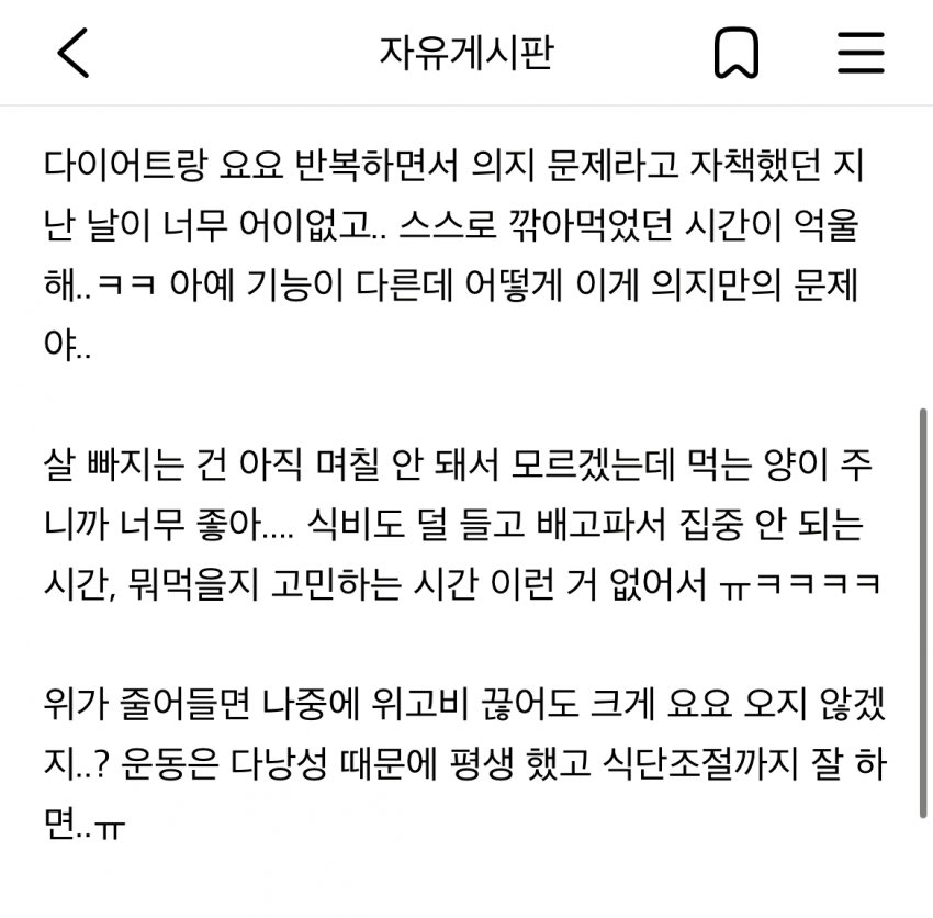 작성시간 25.05.27 근데 비만이라서 처방받을 정도면 조금 먹어도 잘 안빠질수도... 나도 진짜 조금 먹고 아무리 운동해도 일정 몸무게 이상 안내려감 정상체중도 힘들더라고