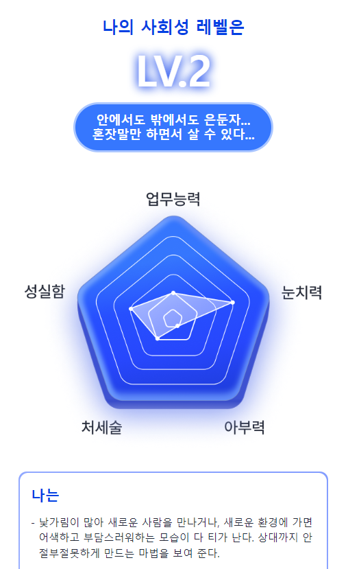 [기타]나는 사회성 부족일까? 사회성 테스트 작성자아삭아삭아삭|작성시간22.07.31|조회수2,061 목록 댓글 25 글자크기 작게가 글자크기 크게가 https://poomang.com/t/slife-monimo-2?c=9&kc=13 사회성 테스트나는 사회성 부족일까?poomang.com 내 결과.. 다음검색 현재 게시글 추가 기능 열기 북마크 공유하기 신고 센터로 신고 댓글 댓글 25 댓글쓰기 답글쓰기 댓글 리스트 작성자람람랑 | 작성시간 22.08.01 1,, 작성자애옹씨 | 작성시간 22.08.01 오 신기하네 사회성 ㅅㅂ재기한줄 알았는데 이미지 확대 작성자박산다라 | 작성시간 22.08.01 오각형 크기 실화냐^^... 이미지 확대 작성자합격원해 | 작성시간 22.08.01 다행이네.. 사회성보다는 외향성 테스트 느낌?? 나 사회성 잭이했는데 흑 이미지 확대 작성자내가바로오리 | 작성시간 22.08.01 맞는거같음 인생의 모토가 중간만큼하자임 이미지 확대 댓글 전체보기