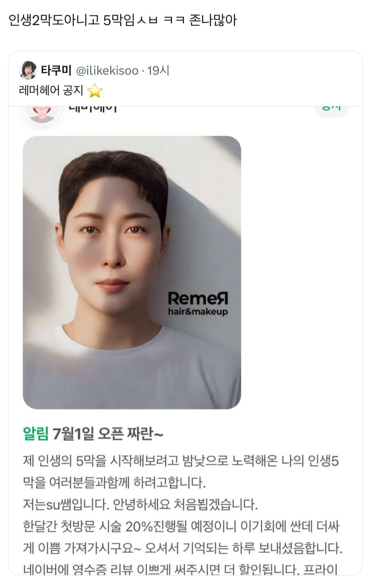 [기타]미용실 오픈한 김기수 작성자보라돌빡이|작성시간25.07.02|조회수3,780 목록 댓글 16 글자크기 작게가 글자크기 크게가 다음검색 현재 게시글 추가 기능 열기 북마크 공유하기 신고 센터로 신고 댓글 댓글 16 댓글쓰기 답글쓰기 댓글 리스트 작성자니가 내 별이다 *•. | 작성시간 25.07.02 진짜임??? 작성자그만울어 | 작성시간 25.07.02 근데 참 열심히 산다 작성자썀푸가되고싶어 | 작성시간 25.07.02 성격 이상한건 별개로 ㅈㄴ열심히 사는건 팩트긴함ㅋㅋㅋㅋ 작성자재밍이 | 작성시간 25.07.02 5막ㅋㅋㅋㅋㅋㅋㅋ 진짜 열심히 살긴 하는구나 작성자을사년 | 작성시간 25.07.03 진짜 ㅋㅋㅋㅋㅋㅋㅋㅋㅋㅋㅋㅋ 댓글 전체보기
