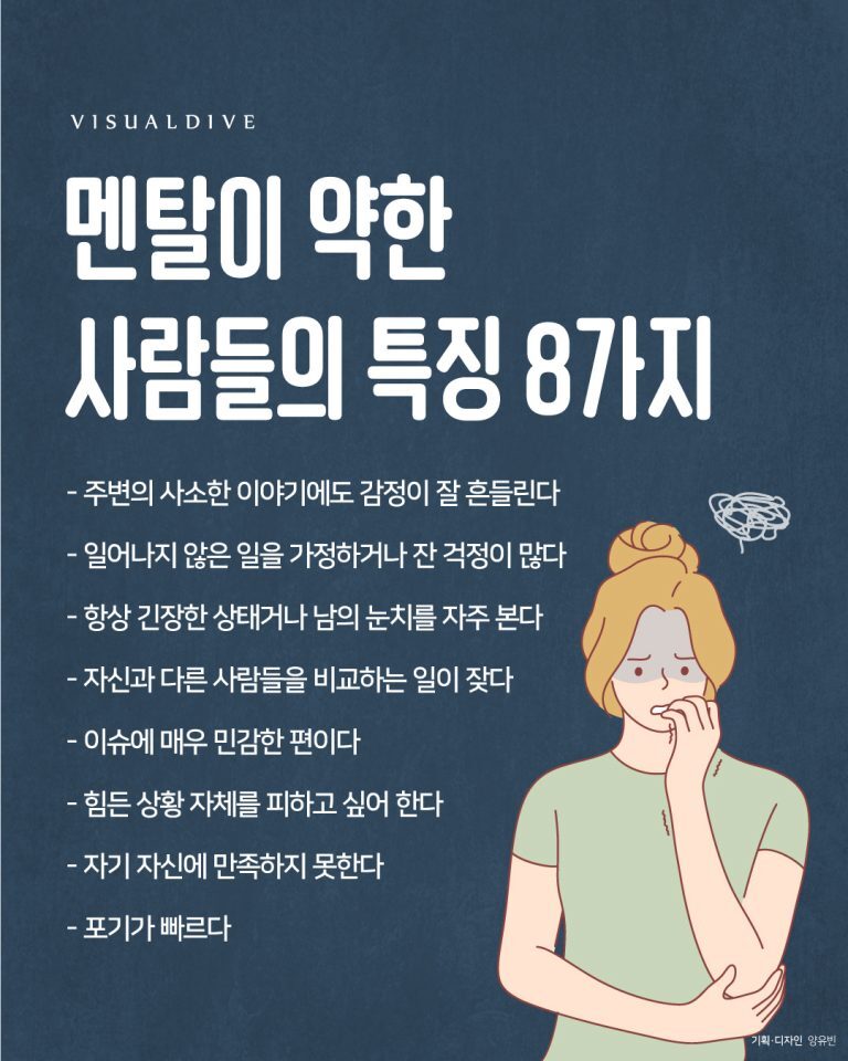 반대로 한다면 멘탈이 단단해질 수 있는 약한 멘탈의 특징 8가지를 알아보았다.