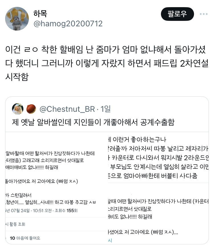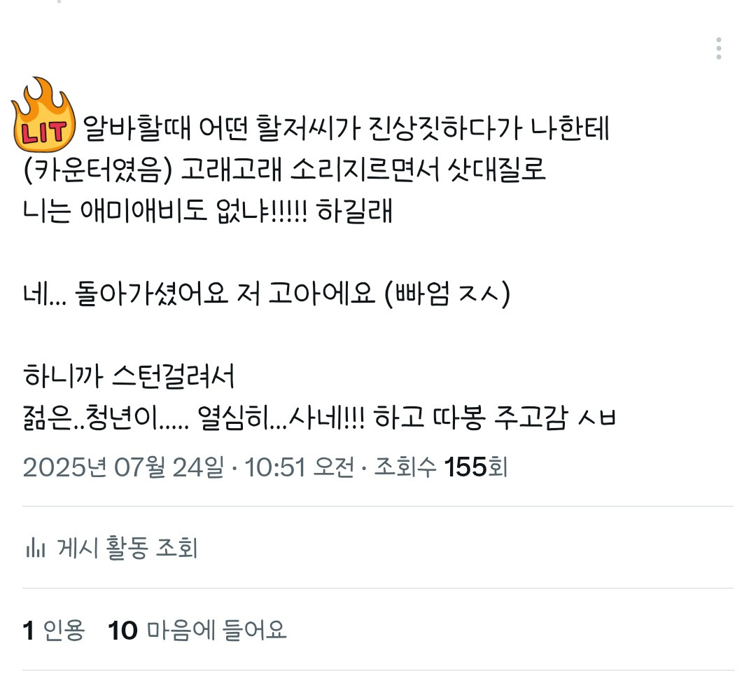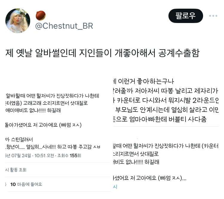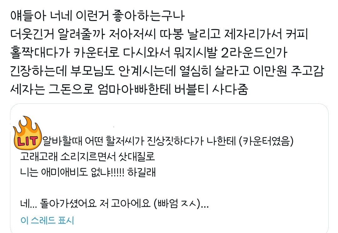 우리 동네 목욕탕 [기타]제 옛날 알바썰인데 지인들이 개좋아해서 공계수출함.twt 작성시간25.07.25|조회수10,701 목록 댓글 4 글자크기 작게가 글자크기 크게가 《 우리 동네 목욕탕 / 출소 후 우동탕이 유일한 낙입니다 》 https://x.com/chestnut_br/status/1948248319915868465?s=46&t=qwUKrvyd8DoOTCv7KDJf2AX의 🌰님(@Chestnut_BR)제 옛날 알바썰인데 지인들이 개좋아해서 공계수출함x.comX의 하목님(@hamog20200712)이건 ㄹㅇ 착한 할배임 난 줌마가 엄마 없냐해서 돌아가셨다 했더니 그러니까 이렇게 자랐지 하면서 패드립 2차연설 시작함x.com 다음검색 현재 게시글 추가 기능 열기 북마크 공유하기 신고 센터로 신고 댓글 4 댓글 리스트 작성시간 25.07.25 마지막 ㅅㅂ 저게 찐이다.. 작성시간 25.07.25 ㅋㅋㅋㅋㅋㅋㅋ 찐들은 옳타구나!하면서 더 갑질해대지.. 그래도 할배가 양심이 있네 작성시간 25.07.25 마지막은 진짜 왜그러고사냐 작성시간 25.07.25 마지막 할매한테는 할머니는 부모잇냐고 물어보면될듯 없으니까 그렇게 진상부리지 카페 방문해 더 많은 댓글 만나기!