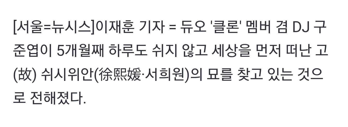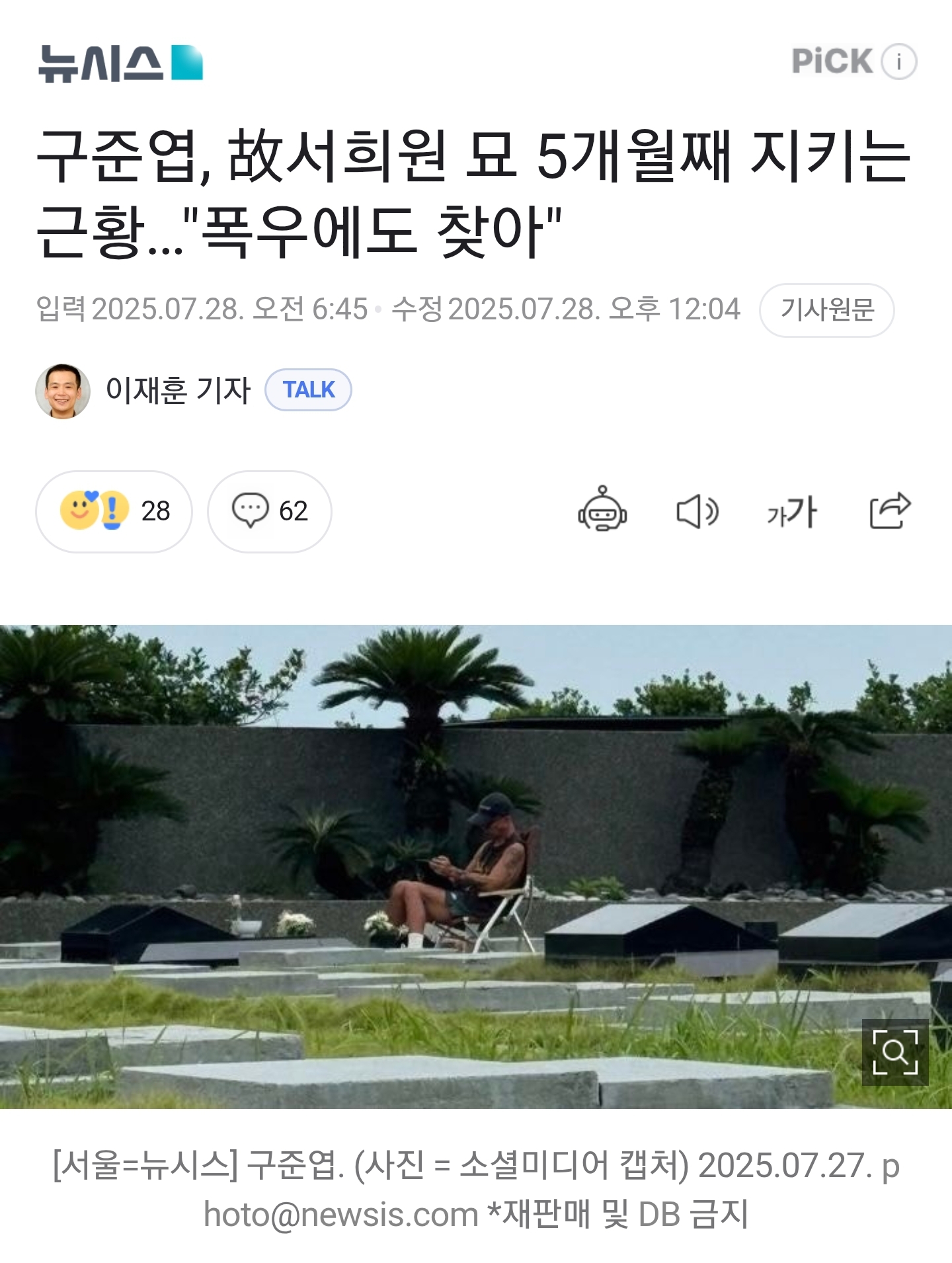 우리 동네 목욕탕 [기사]구준엽, 故서희원 묘 5개월째 지키는 근황…"폭우에도 찾아" 작성시간25.07.28|조회수5,101 목록 댓글 3 글자크기 작게가 글자크기 크게가 《 우리 동네 목욕탕 / 전광렬 》 https://naver.me/FDGQEcEJ구준엽, 故서희원 묘 5개월째 지키는 근황…"폭우에도 찾아"듀오 '클론' 멤버 겸 DJ 구준엽이 5개월째 하루도 쉬지 않고 세상을 먼저 떠난 고(故) 쉬시위안(徐熙媛·서희원)의 묘를 찾고 있는 것으로 전해졌다. 28일 소셜 미디어 등에 따르면, 쉬시위안이 영n.news.naver.com 다음검색 현재 게시글 추가 기능 열기 북마크 공유하기 신고 센터로 신고 댓글 3 댓글 리스트 작성시간 25.07.28 ㅜㅜ...사진은 누가 찍은거야? 가만히 놔두지ㅜㅠ 작성시간 25.07.28 나라면 못산다 너무 사는게 힘들어 작성시간 25.07.28 진짜 신이 있는 거 맞냐... 카페 방문해 더 많은 댓글 만나기!