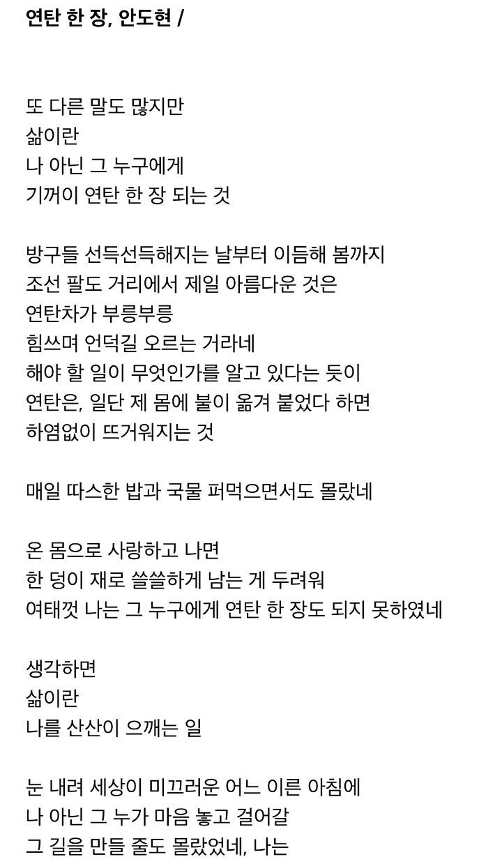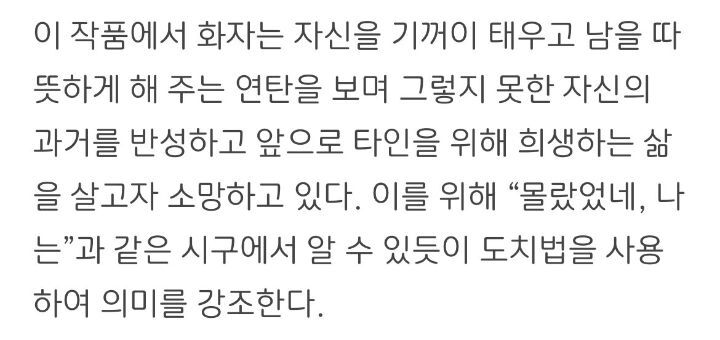 우영우 12화 류재숙 변호사가 낭독한 시.. 남을 위해 자신을 희생하는 연탄(류재숙)을 보며 그렇지 못한 과거를 반성하는.. 아마 앞으로 영우의 변호사 생활에 대한 미래를 암시하는 것 같음 pic.twitter.com/BKWHe1lDLR