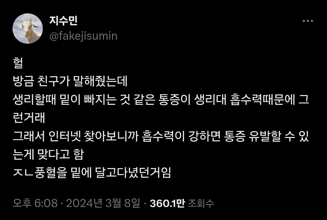 작성시간 25.12.17 난 첫날만 저 느낌나는데 생리대 때문은 아니였음.. 순면생리대 빨아쓰는거로 써도 아프긴 아팠음 ㅠㅠ