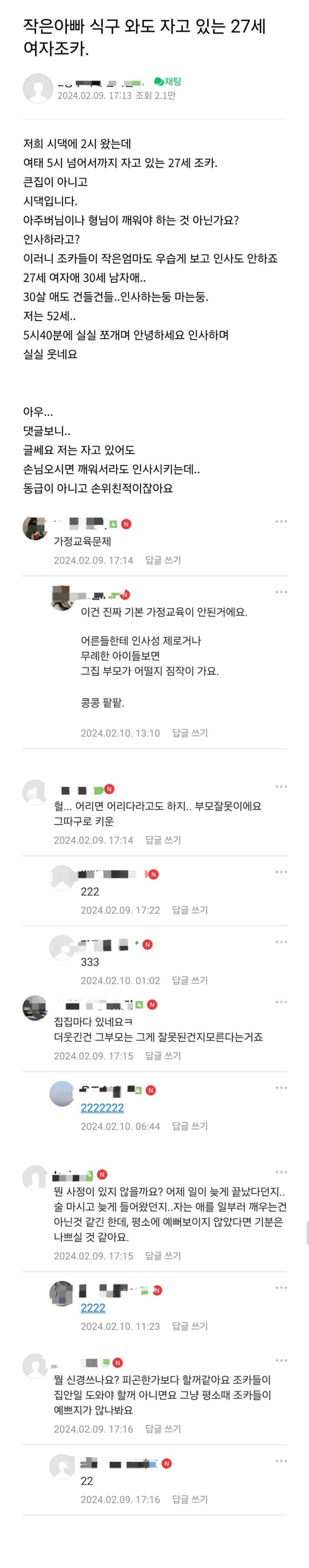 작성자코카콜라카스타드 작성시간 25.12.30 헐 우리집은 저러면 ㅈㄴ 예의없고 못 배워먹은 행동이라고 생각함 다른 날도 아니고 명절이잖아 당연히 다 나가서 인사해야지 ;; 이런 게 다 가정교육인 건데