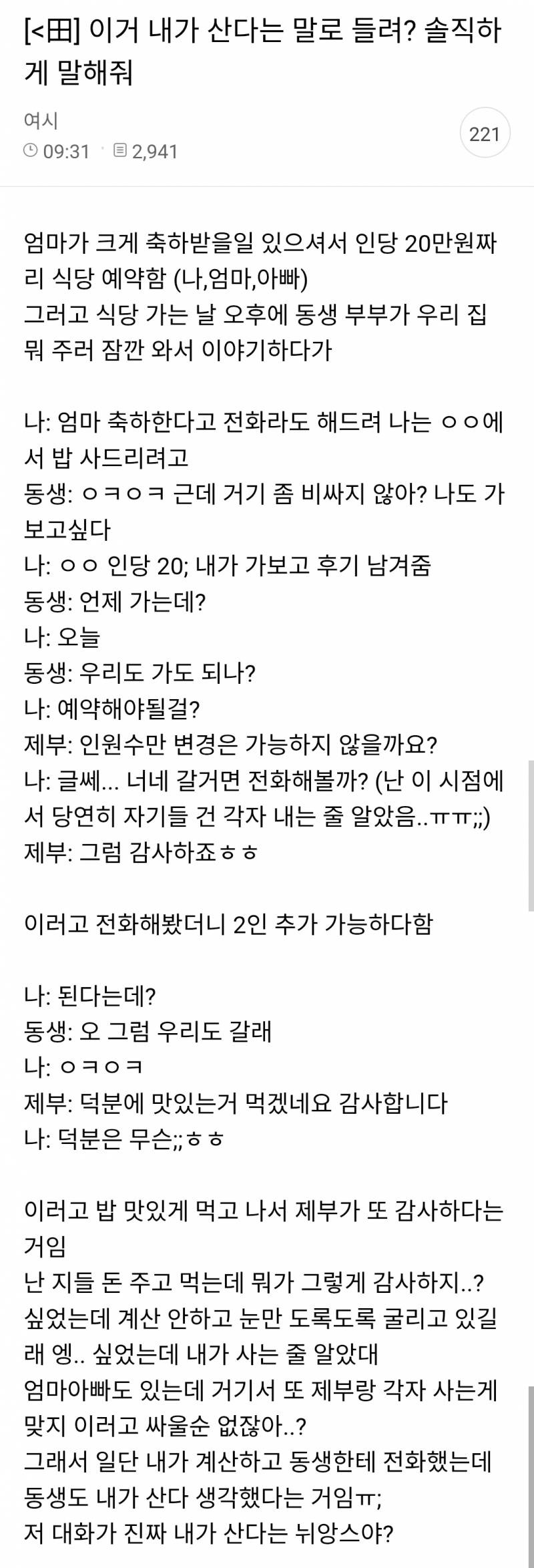 전체적으로 사준다는 뉘앙스이긴함 가보고 후기 남겨줌 이건 선 긋는다기 보다는 걍 예약을 미리 안했어서 당연히 같이 못갈거라 생각해서 한 말이라고 받아들여졌을듯 근데 애초에 동생네가 양아치긴함 같이 보태서 사드리진 못할망정ㅋ