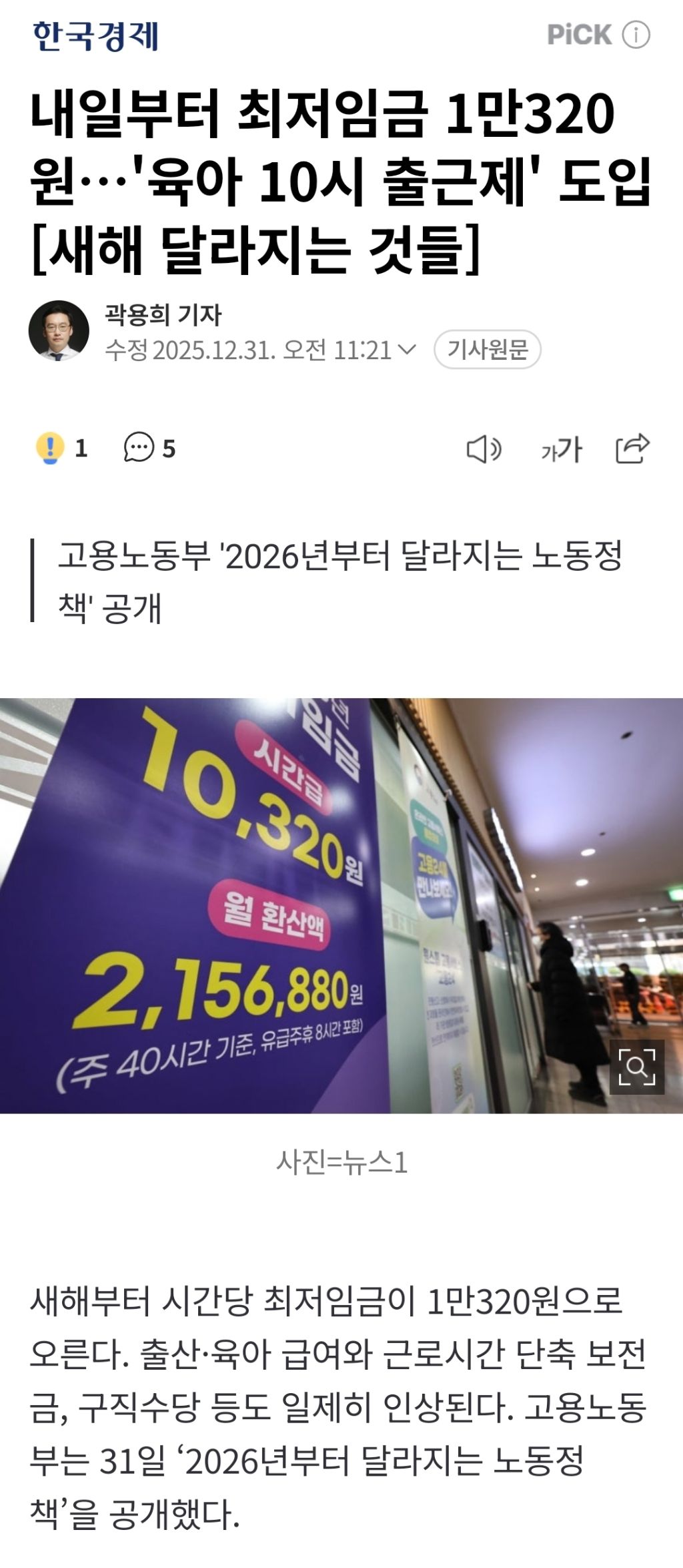 [기사]내일부터 최저임금 1만320원…'육아 10시 출근제' 도입 작성자김말e|작성시간25.12.31|조회수789 목록 댓글 21 글자크기 작게가 글자크기 크게가 《 우리 동네 목욕탕 / 김말e 》 https://naver.me/II4cispL내일부터 최저임금 1만320원…'육아 10시 출근제' 도입 [새해 달라지는 것들]새해부터 시간당 최저임금이 1만320원으로 오른다. 출산·육아 급여와 근로시간 단축 보전금, 구직수당 등도 일제히 인상된다. 고용노동부는 31일 ‘2026년부터 달라지는 노동정책’을 공개했다. 2n.news.naver.com 다음검색 현재 게시글 추가 기능 열기 북마크 공유하기 신고 센터로 신고 댓글 댓글 21 댓글쓰기 답글쓰기 댓글 리스트 작성자살랴줘요살려주십시오 | 작성시간 25.12.31 new 아 ㅅㅂ비 작성자이유한 | 작성시간 00:29 new 최저임금도 진짜 ..ㅋㅋ.. 작성자닭다리 | 작성시간 00:34 new ㅈㄹ 만12세면 다 컸고만 옘병떠네 ㅅㅂ 작성자민트라임 | 작성시간 00:50 new 사업주 삼십 안 받고 풀로 근무하는게 이득이지 뭔 꼴랑 삼십주면서 ㅋㅋㅋ 이십명 있는 부서에 세명이 임신해서 네시 퇴근하는데 생산성 박살 ㅋㅋ 작성자뿜뿜붐 | 작성시간 07:47 new 좆같네 ㅋㅋ 댓글 전체보기