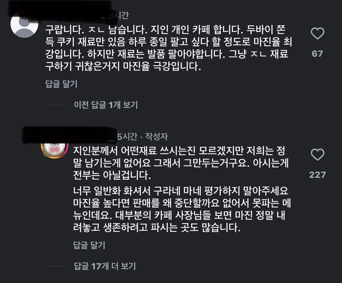 작성자개막해 아니 개 막하지말라고 작성시간 26.01.06 몸 존나갈아서 하루종일 만드는데 마진도 안 나오면 당연히 그만해야지 뭐 지인 카페 한다는 놈 뭘 안다고 맨플임