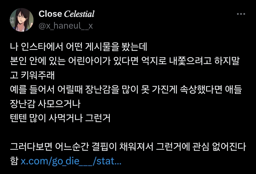 [기타]어떤 게시물을 봤는데 본인 안에 있는 어린아이가 있다면 억지로 내쫓으려고 하지말고 키워주래 작성자정보|작성시간26.01.07|조회수1,645 목록 댓글 16 글자크기 작게가 글자크기 크게가 다음카페 우리 동네 목욕탕https://x.com/i/status/1768650872903582084 다음검색 현재 게시글 추가 기능 열기 북마크 공유하기 신고 센터로 신고 댓글 댓글 16 댓글쓰기 답글쓰기 댓글 리스트 작성자널 좋아해 | 작성시간 26.01.07 ㄹㅇ 맞는거같음 나도 직장인되자마자 텐텐 큰통으로 하나 다먹었더니 이제 안사먹음 작성자뽀뽀뽀 | 작성시간 26.01.07 진짜맞는거같애.. 장난감 같은거 미친듯이 샀었는데 이젠 다버리고 그런거 일절 안삼... 작성자태룽선수촌 | 작성시간 26.01.07 나도 텐텐… 작성자연예인마리 | 작성시간 26.01.07 ㅇㅋ구슬아이스크림 존나먹을게 작성자who when what | 작성시간 26.01.07 나는 나만 키워야겠다 열심히 키워줄게 .. ㅜㅜ 댓글 전체보기