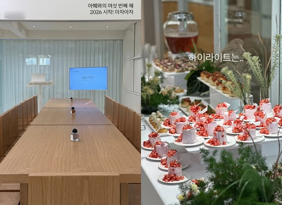 이어 그는 각종 디저트와 핑거푸드가 마련된 럭셔리한 분위기의 시무식 사진을 공개하며, "시무식의 하이라이트는 단연코"라는 글과 함께 최근 핫한 디저트인 두바이 쫀득 쿠키(두쫀쿠), 그리고 두바이 쫀득 김밥을 준비한 사진을 공유했다.