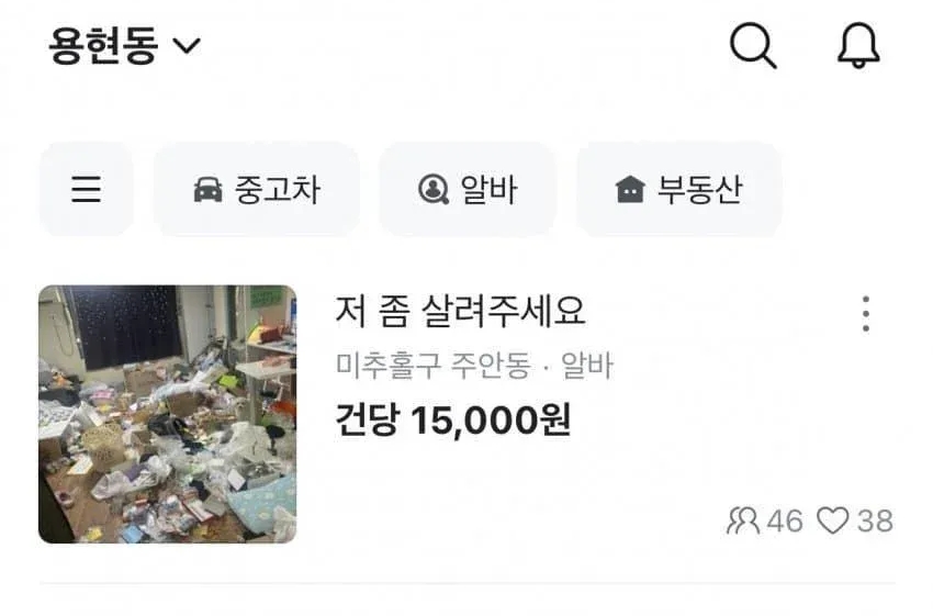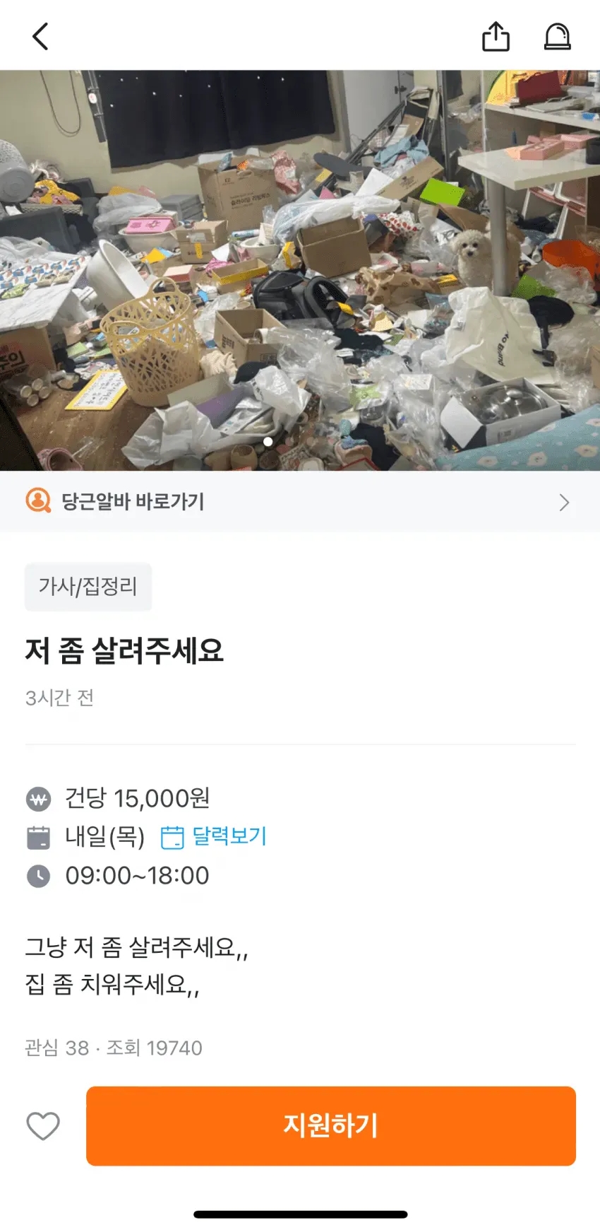 [기타]저 좀 살려달라는 당근 유저.jpg 작성자보라돌빡이|작성시간26.01.07|조회수2,405 목록 댓글 17 글자크기 작게가 글자크기 크게가 다음검색 현재 게시글 추가 기능 열기 북마크 공유하기 신고 센터로 신고 댓글 댓글 17 댓글쓰기 답글쓰기 댓글 리스트 작성자채봉구 | 작성시간 26.01.07 저정도면 한 100나오나... 저기만 치운다는 전제하에.. 작성자알쓸범잡 | 작성시간 26.01.07 병원가세요 진심...이유야 있겠지만 병원도 시급해 보이네 작성자삭제 | 작성시간 26.01.07 업체부르면 2-300부를거같은데 작성자끄뀨까 | 작성시간 26.01.08 가까이 살면 도와주고 싶다..ㅠ 작성자메모를해도됩니다 | 작성시간 26.01.08 강아지불쌍해 댓글 전체보기