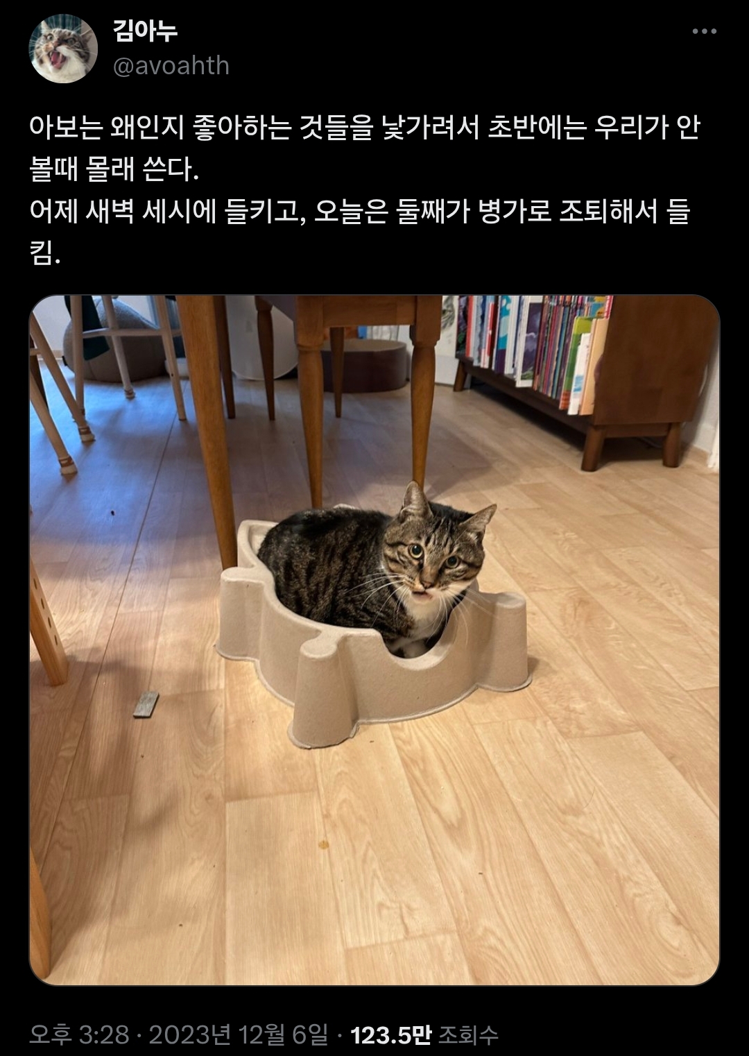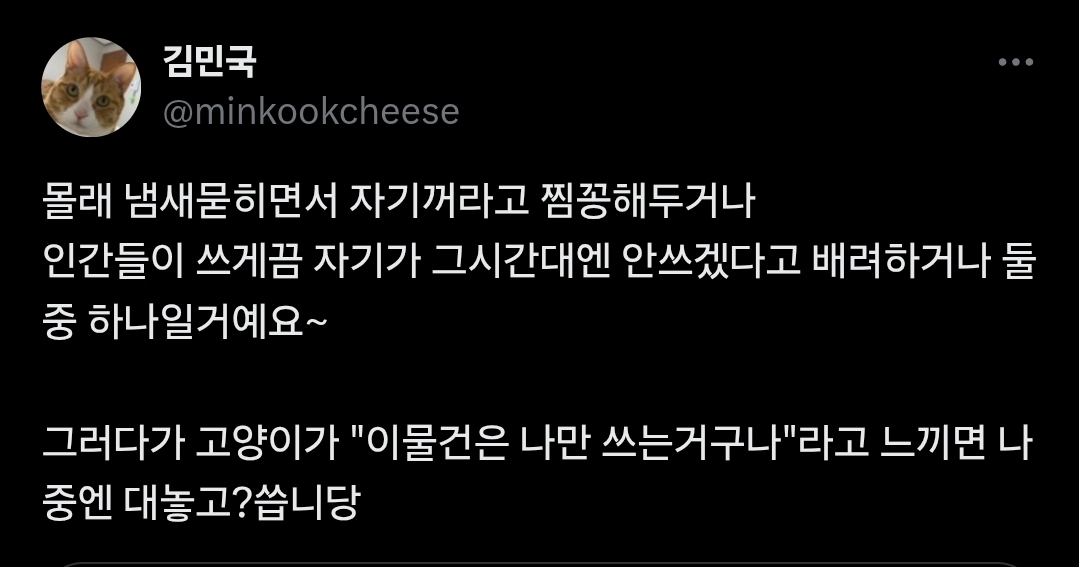 [동물/식물]고양이들이 물건을 몰래 쓰는 이유 작성자정보|작성시간26.01.07|조회수9,656 목록 댓글 6 글자크기 작게가 글자크기 크게가 다음카페 우리 동네 목욕탕https://x.com/i/status/1732285753613533375 다음검색 현재 게시글 추가 기능 열기 북마크 공유하기 신고 센터로 신고 댓글 댓글 6 댓글쓰기 답글쓰기 댓글 리스트 작성자본인 | 작성시간 26.01.07 진짜 너무 사랑스러운 존재들이야아아아~~~아앜 작성자초코쁘띠우유 | 작성시간 26.01.07 넘나 귀엽 작성자이재명_대통령 | 작성시간 26.01.07 맞아 졸라귀여워 언니네 애기있는데 애기 잘때 현관유모차 짐두는곳에 몰래 올라가있는 사진 보고 소리지름 ㅠ 존나귀여워 작성자핫팩 | 작성시간 26.01.07 귀엽게 왜케 눈치를 보는지 그냥 쓰라고!! 작성자우수 | 작성시간 26.01.07 니꺼야 ㅠㅠ 이누마ㅜㅜ 댓글 전체보기