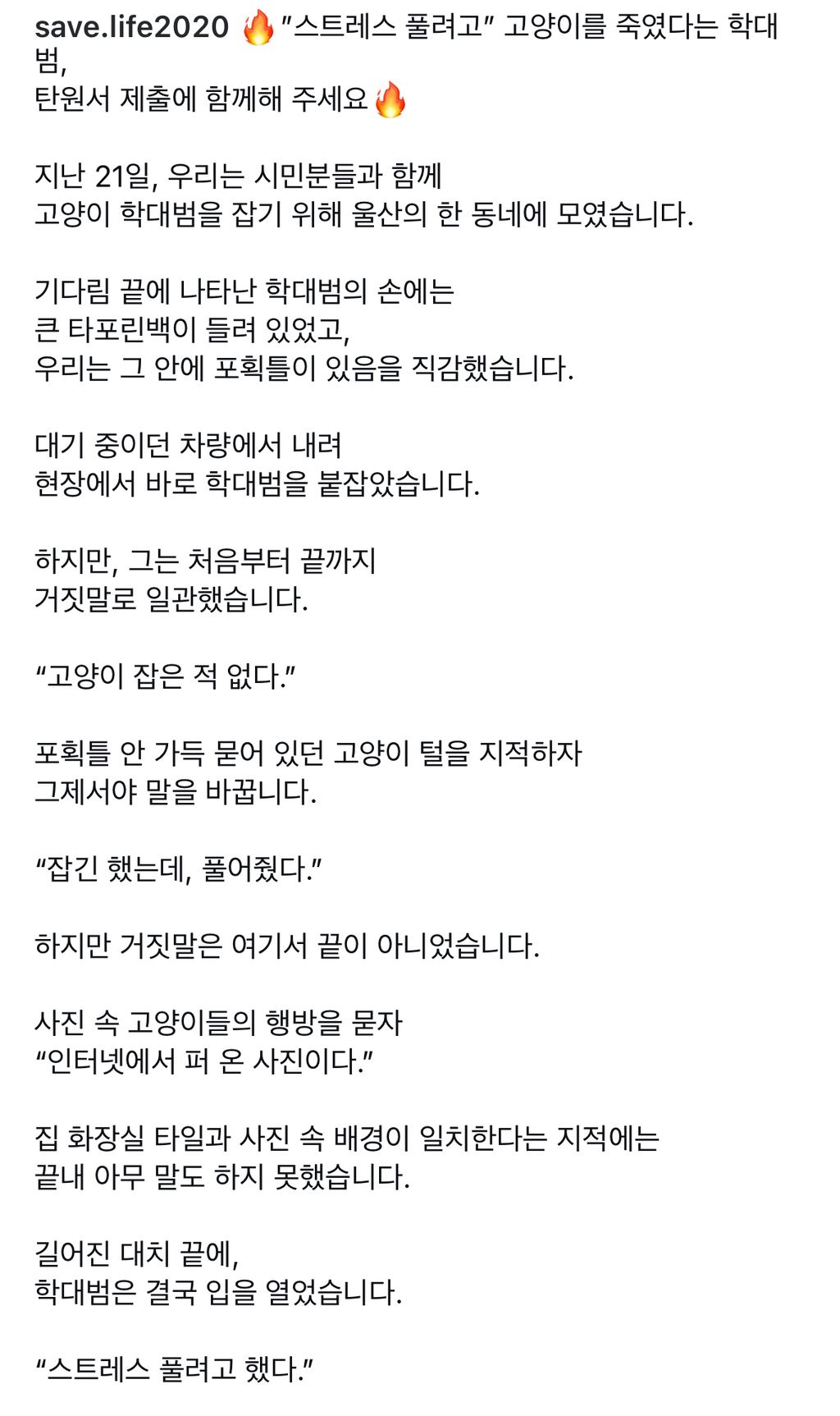 [기타]울산 동물 학대범 수사 및 처벌을 위한 탄원서 작성자사과|작성시간26.03.24|조회수214 목록 댓글 15 글자크기 작게가 글자크기 크게가 《 우리 동네 목욕탕 / 닉네임 》 링크 🔻https://docs.google.com/forms/d/e/1FAIpQLSfK6j-QNLTgWLDc8Y1BVMlYFClFd1uJmM_yodVzLGQoUkBwQg/viewform부탁해 ㅠhttps://m.cafe.daum.net/subdued20club/ReHf/5609516출처 여시 다음검색 현재 게시글 추가 기능 열기 북마크 공유하기 신고 센터로 신고 댓글 댓글 15 댓글쓰기 답글쓰기 댓글 리스트 작성자파란구름 | 작성시간 26.03.24 new 완 작성자조청유과 | 작성시간 26.03.24 new 완 작성자밥밥디라라쿵짝 | 작성시간 26.03.24 new 완 작성자이에로사이다 | 작성시간 26.03.24 new 완 작성자전갈자리해물탕팀 | 작성시간 00:17 new 완 댓글 전체보기