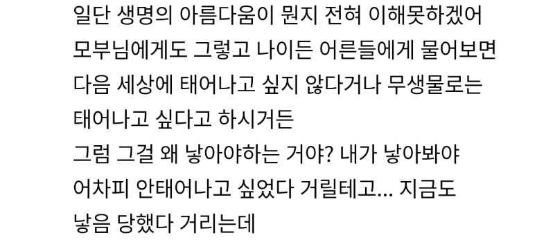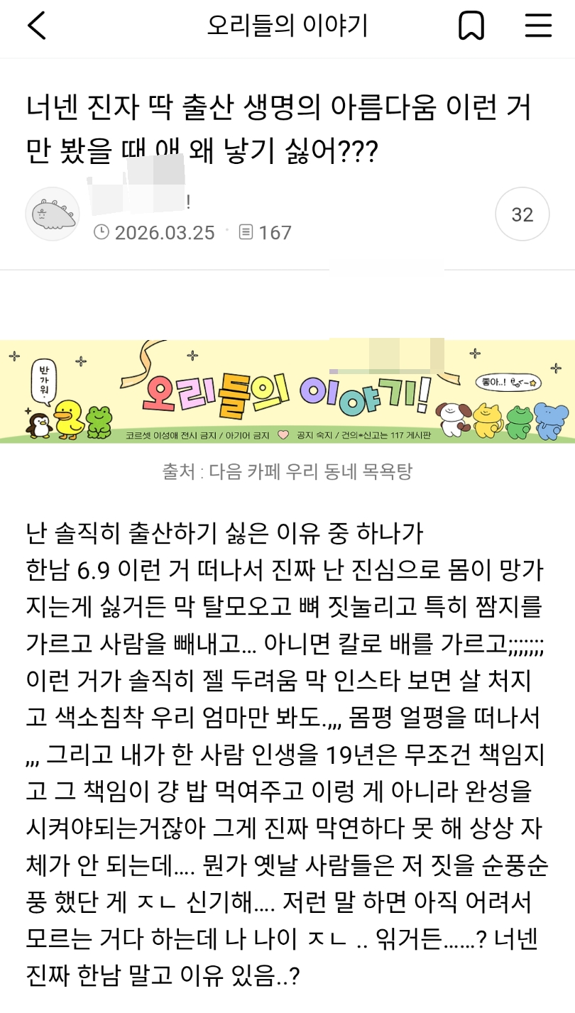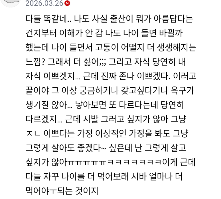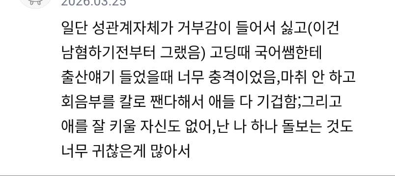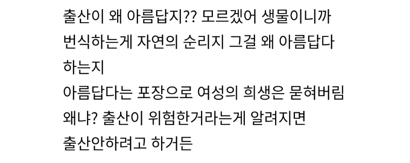 너넨 진자 딱 출산 생명의 아름다움 이런거만 봤을 때 애 왜 낳기 싫어???