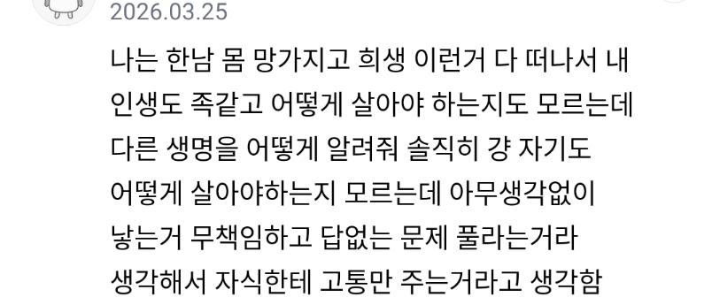 애를,,,맘에 안든다고 버릴 수가 없잖아 내가 벗어날 수 없는 상황이 된다는게 감당이 안됨